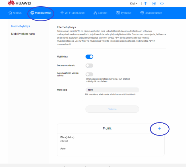 3. Mene Mobiiliverkko -välilehdelle ja valitse Profiilit alta "+"