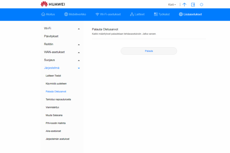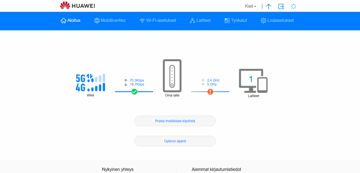 Salasana: Elisan asentamilla laitteilla salasana on sama kuin laitteen WiFi-salasana (WiFi-Password). WiFi-salasanan löydät virtalähteen sivulta tarrasta. Halutessasi voit vaihtaa salasanan hallintaliittymässä kohdasta Wi-Fi-asetukset.