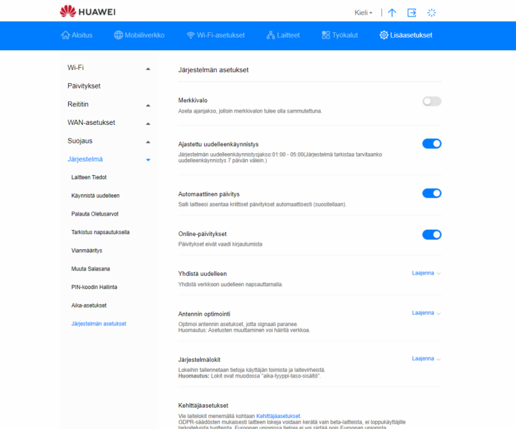 Reitittimellä on yleensä automaattisesti valittuna järjestelmän ajastettu uudelleenkäynnistys. Hallintaliittymässä kohdassa Lisäasetukset > Järjestelmä > Järjestelmän asetukset voit muokata mm. tätä asetusta. Huomioithan kuitenkin että laite on hyvä ajoittain käynnistää uudelleen.
