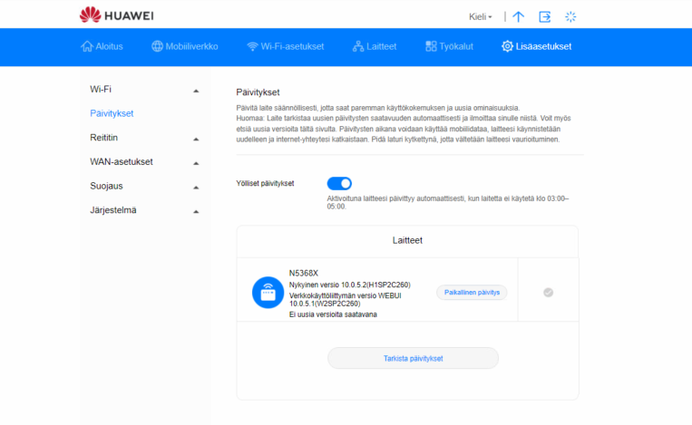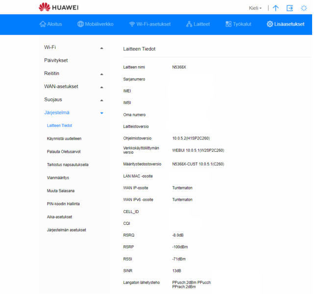 Voit tarkistaa signaalivoimakkuudet kirjautumalla laitteen hallintaliittymään ja siirtymällä kohtaan Lisäasetukset > Järjestelmä > Laitteen tiedot.