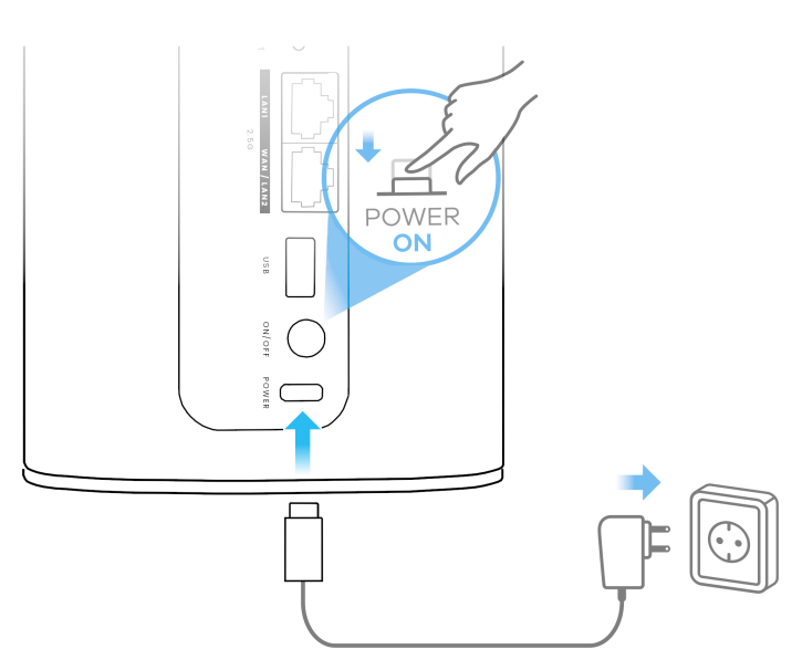 Käynnistä laite painamalla virtapainiketta. Reititin muodostaa automaattisesti nettiyhteyden.