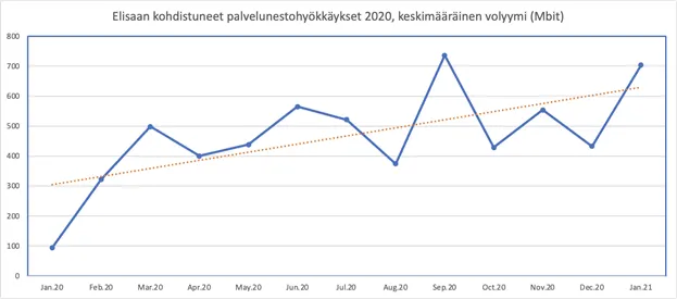 During the last year, there have been tens of thousands of high-end DoS attack alerts in Elisa’s data networks, almost all of which were blocked automatically at the network level. This is equivalent to several dozen high-end DoS attacks every day.
