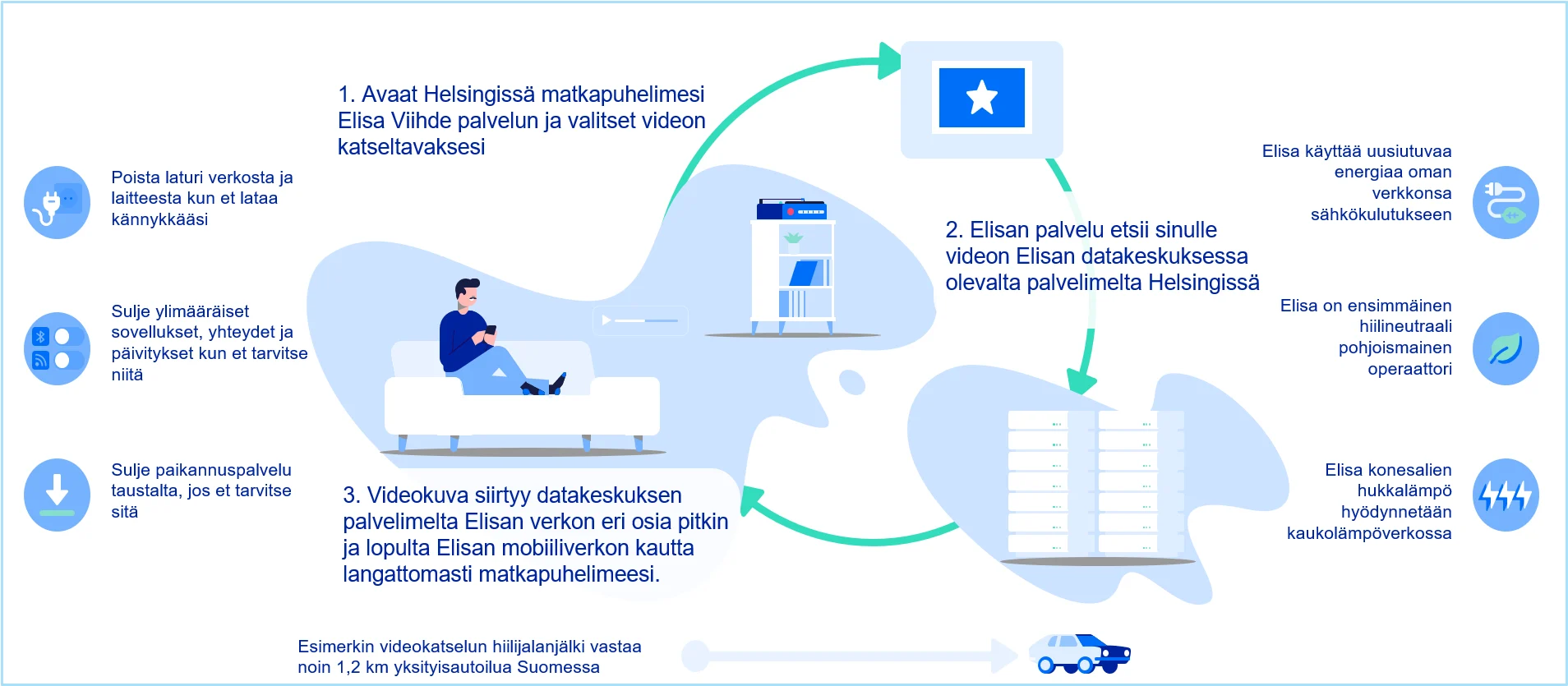 Näin laskettuna arvioimamme Elisa Viihteen tunnin kestävän videonkatselun hiilijalanjälki (gCO2 eqv) vastaa noin 1,2 kilometrin yksityisautoilua Suomessa.