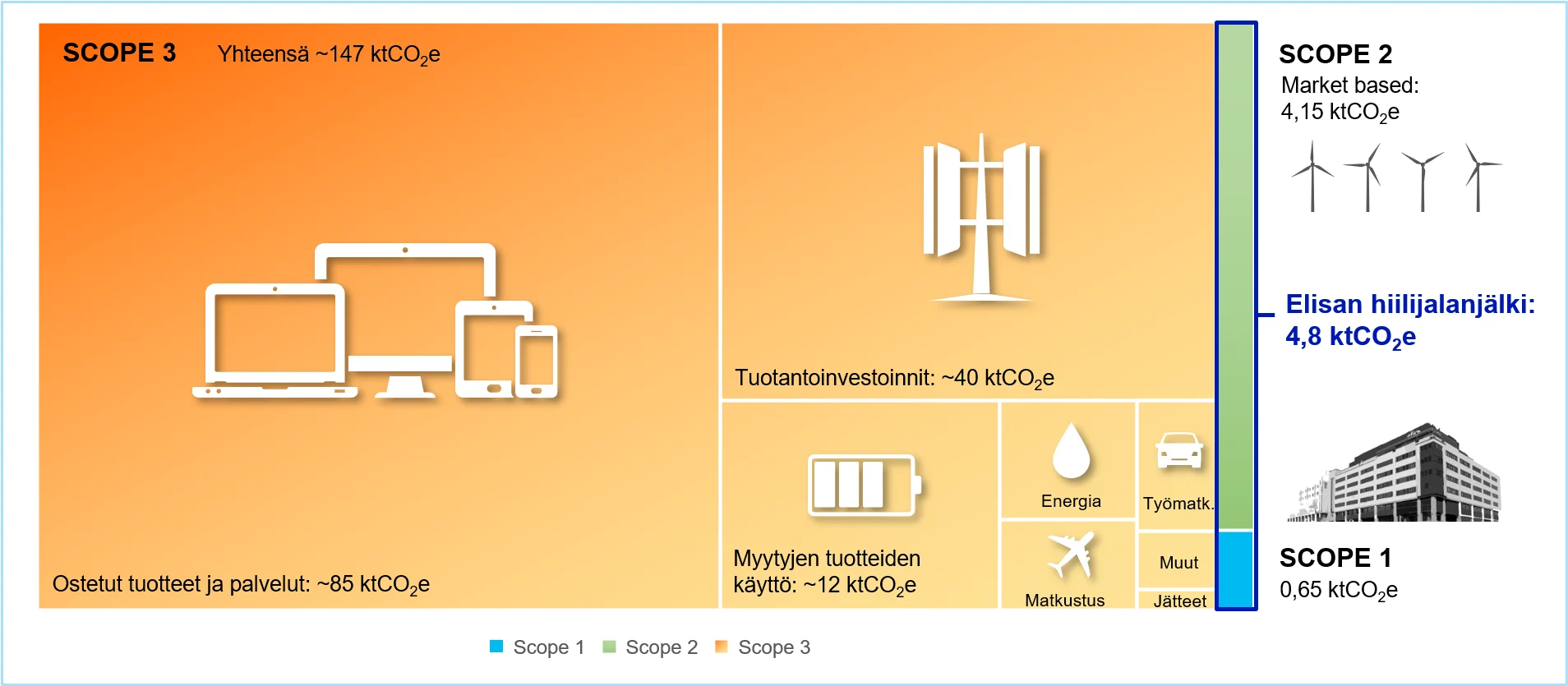 Elisan hiilijalanjäljen laskenta tehdään viimeisimpien valmistuneiden koko vuotta koskevien tilastojen ja saatujen toteumatietojen perusteella. Elisan oma energiankulutus sisältää suoran (scope 1) ja epäsuoran (scope 2) energian käytön. Muut epäsuorat päästöt (scope 3) muodostavat suurimman osan Elisan energiankulutuksesta.