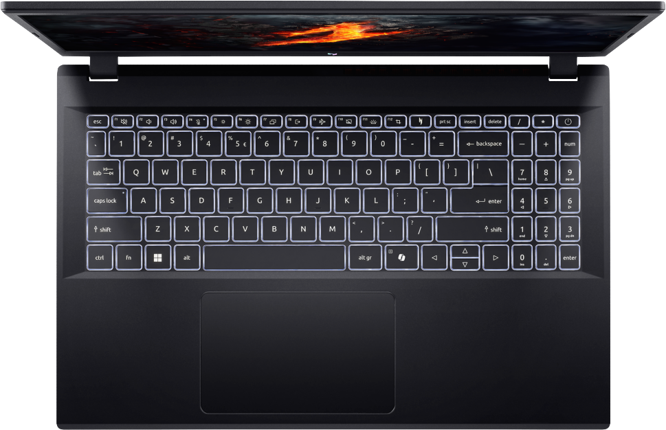 Näppäimistö: Valkoinen taustavalo, NitroSense, Caps Lock -ilmaisin, mikrofonin mykistyksen ilmaisin