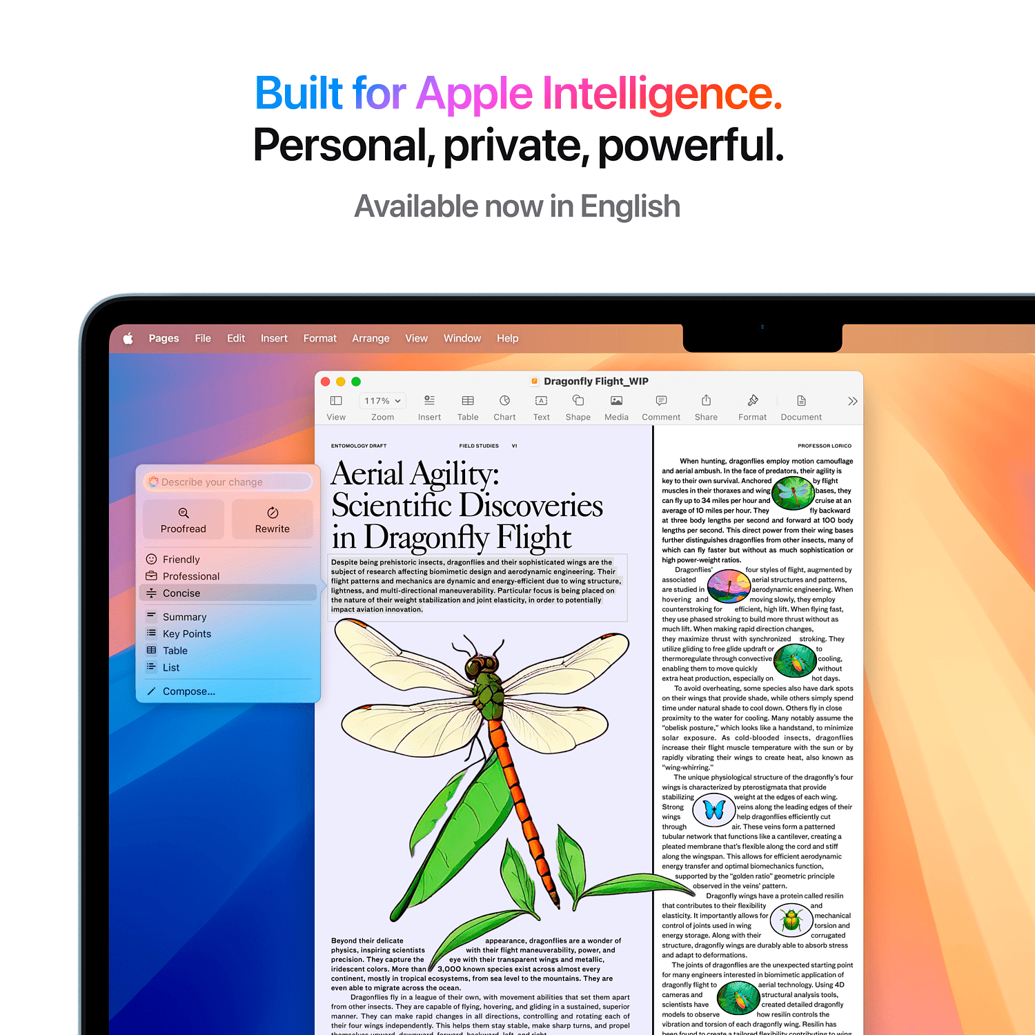 Apple Intelligence on yksilöllinen äly¬järjestelmä, joka on Macisi olennainen osa. Se oppii hyödyntämään käyttö¬historiaasi ja auttaa sinua kirjoittamaan, ilmaisemaan itseäsi ja hoitamaan asioita vaivattomasti Apple Intelligencen avulla voit oiko¬lukea tekstisi ja kirjoittaa siitä erilaisia versioita, kunnes sävy ja sana¬muodot ovat kohdallaan. Voit myös tehdä valitusta tekstistä yhteen¬vedon pelkällä klikkauksella. Luo uusi toiminnon avulla voit luoda sisältöä alusta alkaen ChatGPT:tä käyttäen. Uraauurtava yksityisen pilvitiedon käsittely (Private Cloud Compute) hyödyntää Applen omilla siruilla toimivia laajempia palvelin¬pohjaisia malleja. Se käsittelee moni¬mutkaisiakin pyyntöjä ja huolehtii samalla tietosuojastasi