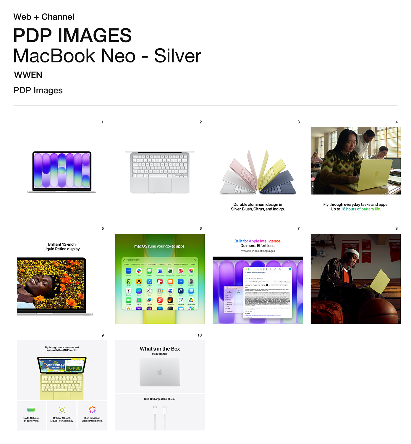 • KAIKKIEN AIKOJEN VÄRIKKÄIN MACBOOK-MALLISTO - Vaihtoehtoina roosa, sitrus, indigo ja hopea, kaikissa samansävyinen näppäimistö. Kestävä alumiinirunko takaa, että MacBook Neo kulkee mukanasi minne ikinä menet.