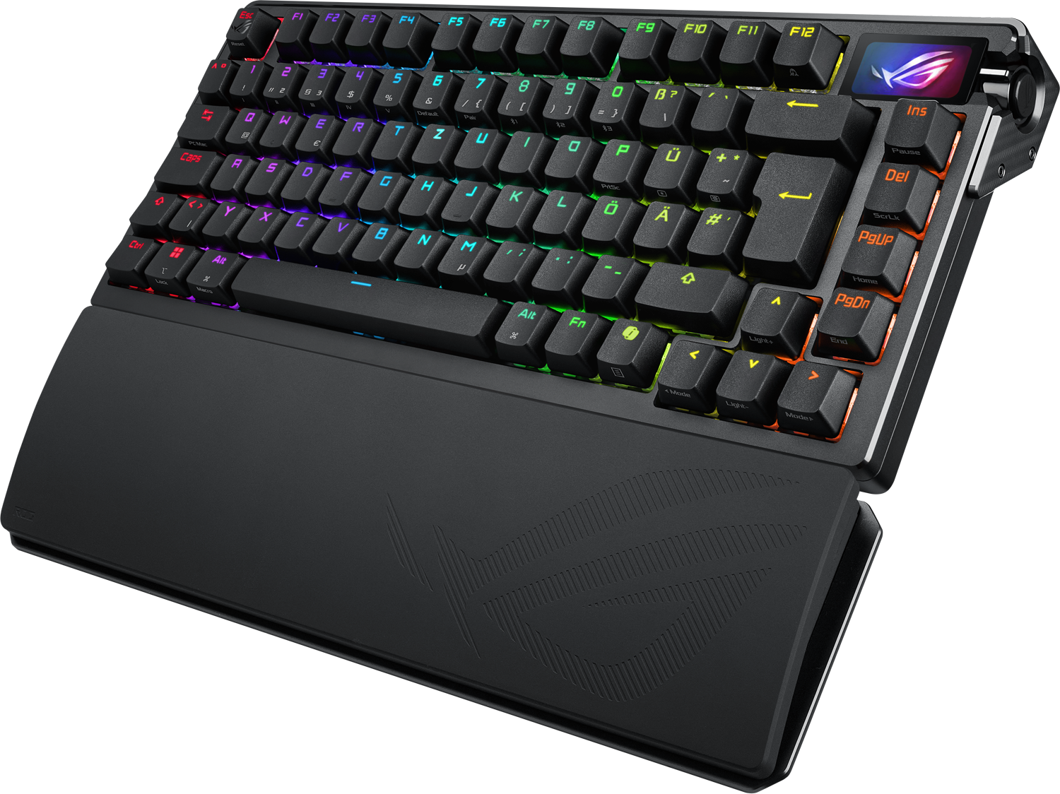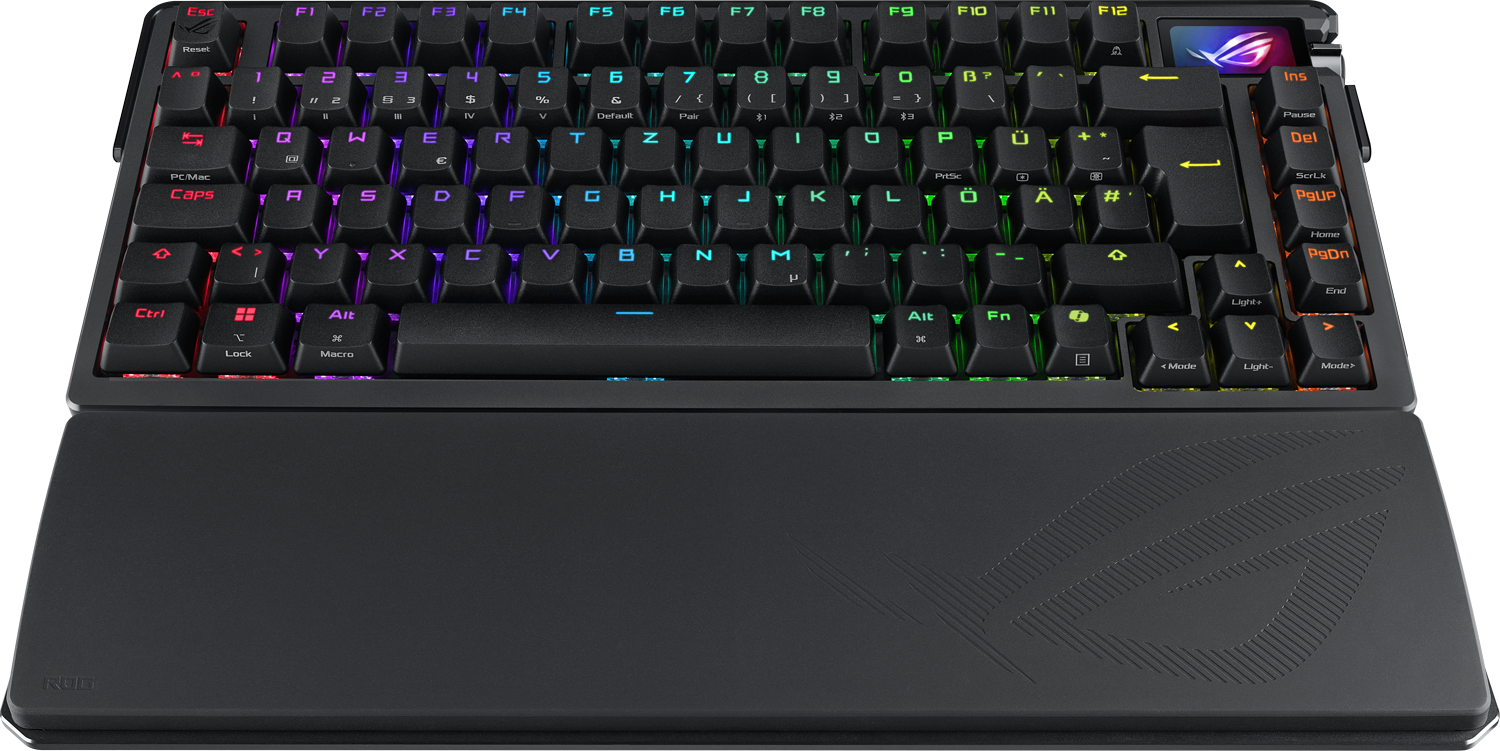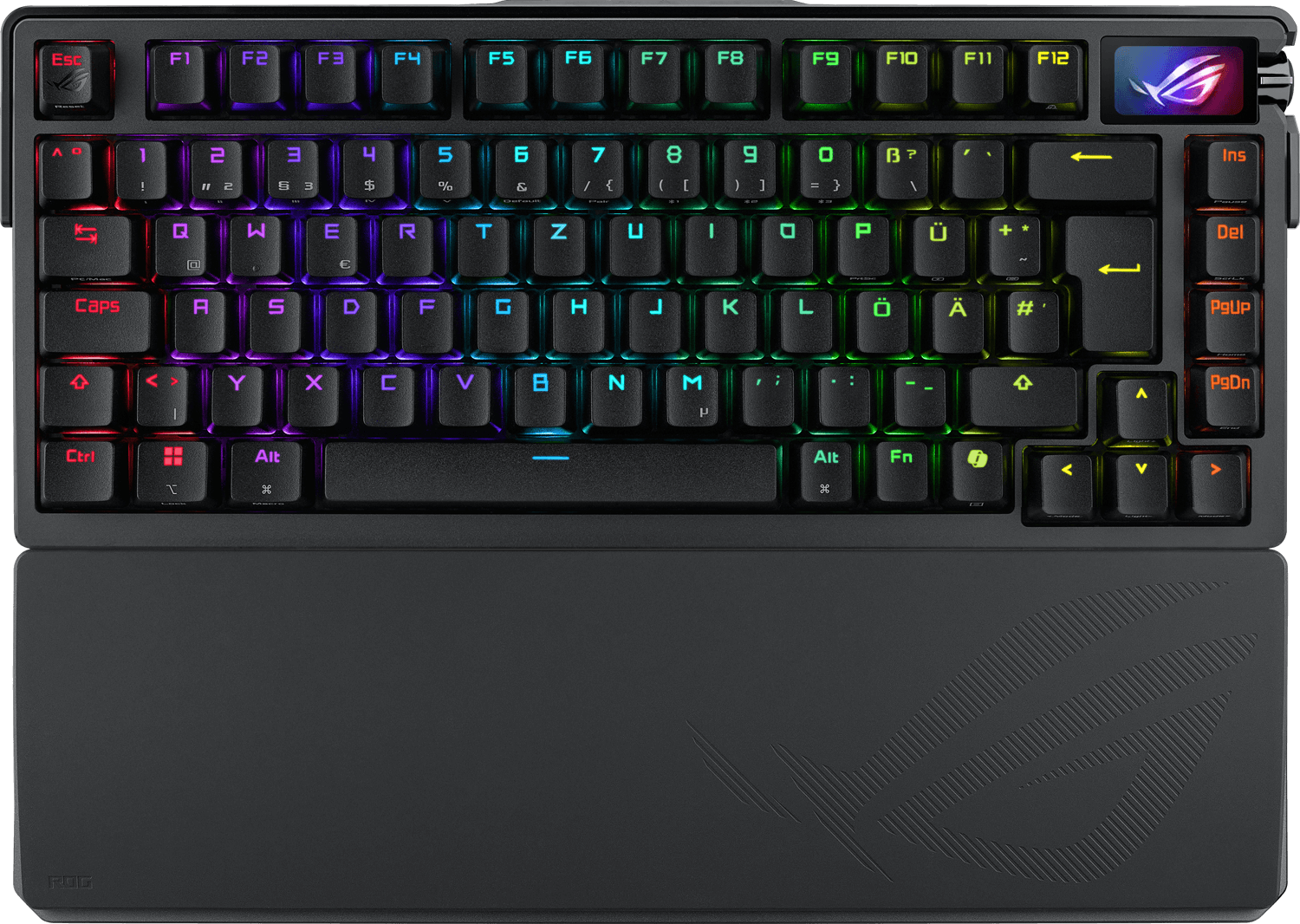Myyntipakkauksen sisältö: Asus ROG Azoth -pelinäppäimistö, rannetuki, kytkimen avaaaja, näppäinhatun irrotustyökalu, kytkimen irrotustyökalu, ROG NX kytkimet, vakautusalustat, USB-dongle, ROG Polling Rate Booster-dongle, USB-kaapeli, USB-jatkopala, CTRL-näppäinhattu, ROG tarra, käyttäjän dokumentaatio