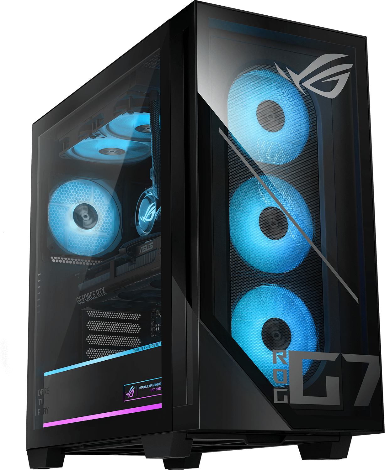 58L ROG-alusta, jossa on suuri ilmavirtaus Nelituuletinjärjestelmä antaa Strix G700:lle runsaasti raitista ilmaa, jotta lämpötila pysyy kurissa myös pitkien pelisessioiden aikana. Jokaisessa G700:ssa on kolmen tuulettimen imu ja takapakoputki, jotka tarjoavat selkeän reitin ilman kulkemiselle järjestelmän läpi mahdollisimman vähin tukoksin. Nestejäähdyttimellä varustetuissa järjestelmissä kaksi jäähdyttimeen asennettua lisätuuletinta poistavat kuuman ilman yläpaneelista. G700:n mukana toimitetaan 240 mm:n AIO-nestejäähdytin. Se pitää suorittimen huipputeholla ja tarjoaa mahdollisuuden käyttää ainutlaatuista tyyliäsi.