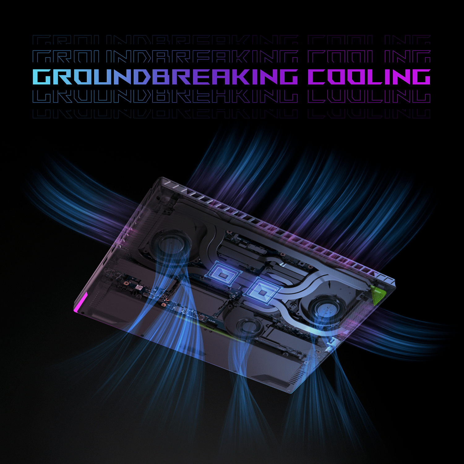 Jotta näin tehokkaat komponentit mahtuvat mukaan, sekä Strix G16:n runko että emolevy on suunniteltu niin, että niihin mahtuu täysleveä jäähdytyselementti, jonka lamellit on siirretty entistä lähemmäksi tuulettimien poistoaukkoja tehokkaamman jäähdytyksen varmistamiseksi. Täysleveä jäähdytyselementti koostuu kolmesta eri osasta, jotka ympäröivät emolevyä tiiviisti sijoitetuilla lamelleilla. Tämä muotoilu maksimoi lämpimän ilman poistumisreitin ja lisää huomattavasti kokonaisilmavirtaa.