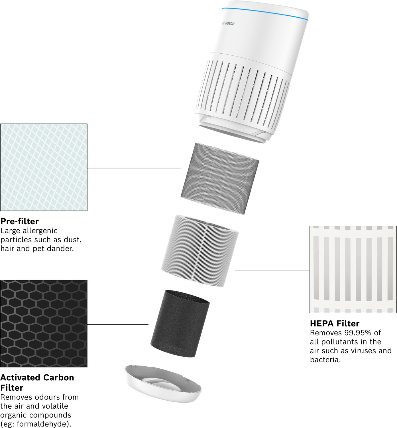Bosch Air 2000 I ‑ilmanpuhdistin on suunniteltu sinulle, joka haluat hengittää turvallista ja puhdasta sisäilmaa vuoden ympäri. Se suodattaa pois yli 99 % ilmassa olevista hiukkasista, kuten pölyn, siitepölyn ja lemmikkien allergeenit. Laite sopii erityisen hyvin kotiin, jossa halutaan vähentää epäpuhtauksia ja lisätä arjen mukavuutta yksinkertaisella ja tehokkaalla ratkaisulla.
