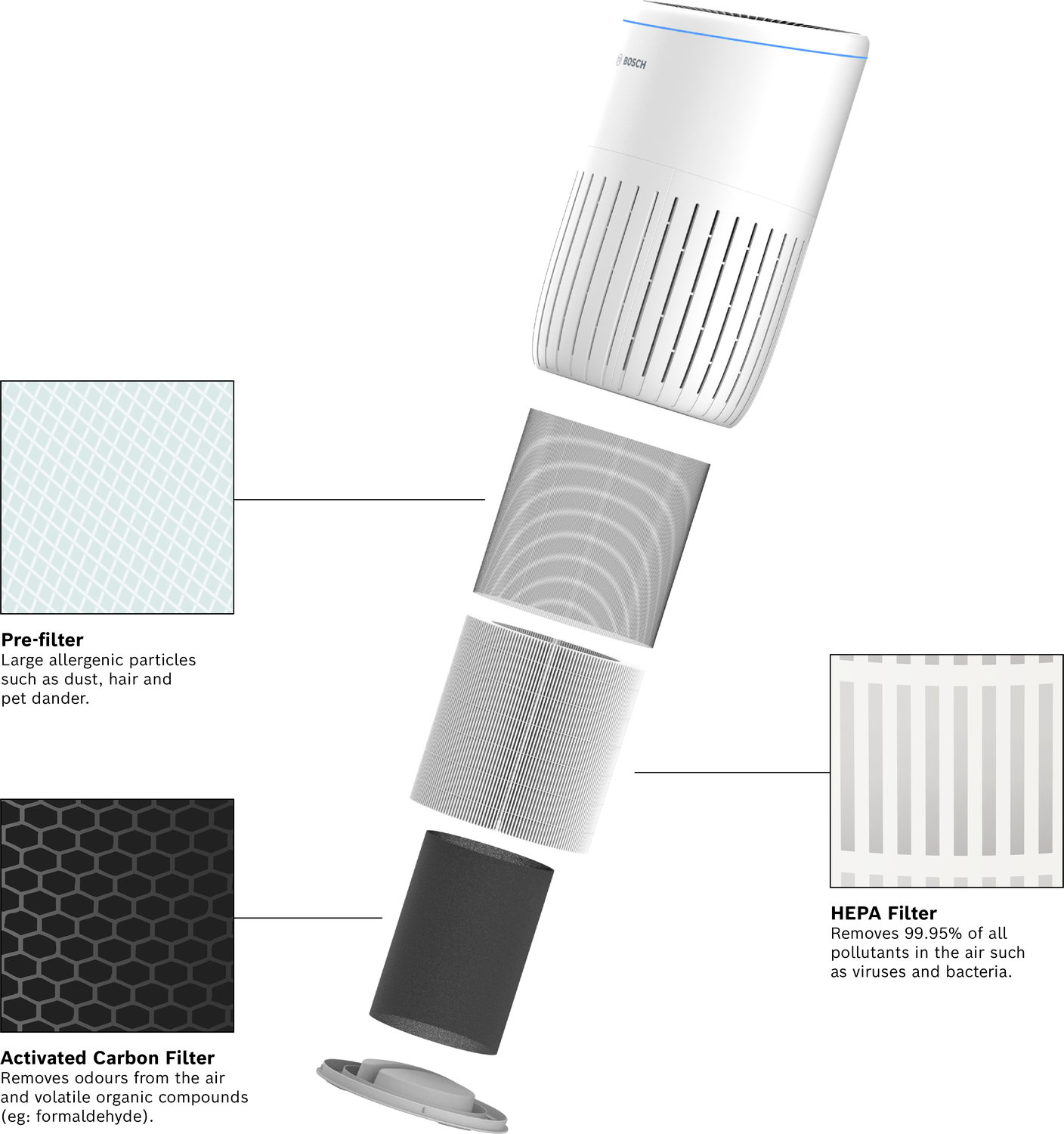 Bosch Air 4000 I ‑ilmanpuhdistin tarjoaa tehokkaan tavan parantaa kotisi sisäilman laatua. Se on suunniteltu erityisesti tilanteisiin, joissa suurempi tila tarvitsee luotettavaa ja voimakasta puhdistusta. Yli 99 % puhdistustehokkuus auttaa poistamaan pölyn, savun, allergeenit ja muut ilmassa leijuvat hiukkaset, mikä tekee siitä sopivan ratkaisun niin perheille kuin lemmikkikoteihin.