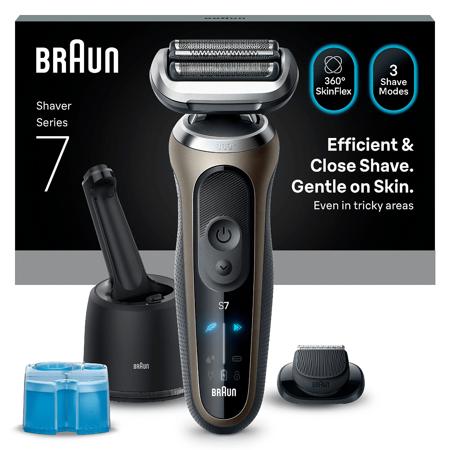 Braun Series 7 72-C7200cc -parranajokone on suunniteltu tarjoamaan entistä tarkemman ja nopeamman ajon verrattuna aiempiin Series 7 -malleihin. Sen 360° SkinFlex -ajopää mukautuu kasvojen muotoihin ja yltää vaivatta myös vaikeasti ajettaviin kohtiin, kuten leukalinjaan ja nenän alle. Kolme erilaista ajotilaa - Turbo, Gentle ja Standard - mahdollistavat ajokokemuksen räätälöinnin omien mieltymystesi mukaan.