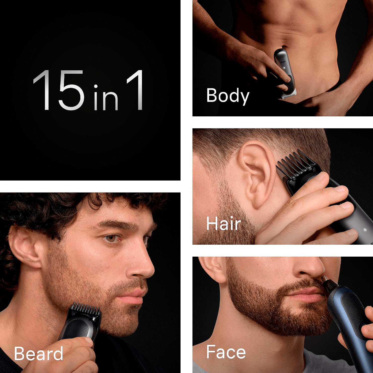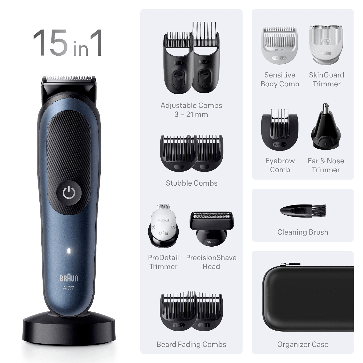 Braunin 15-in-1-setti koko vartalon käsittelyyn sisältää valikoituja välineitä parran, korvien ja nenän trimmaukseen, hiusten leikkaamiseen ja vartalon ihokarvojen muotoiluun