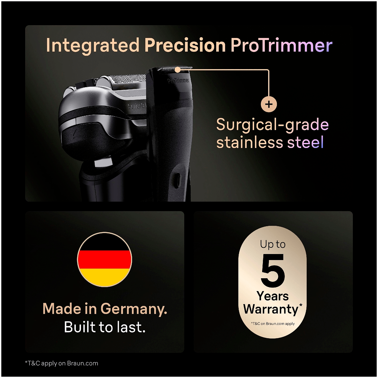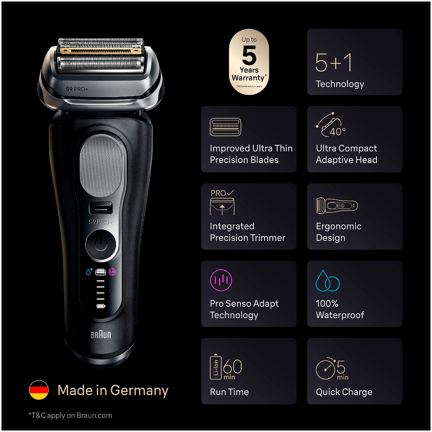 Braun Series 9 PRO+ on valmistettu korkealaatuisista materiaaleista ja suunniteltu kestämään vuosien käyttöä. Sen huippuluokan rakenne ja saksalainen insinööritaito takaavat luotettavan suorituskyvyn päivästä toiseen.