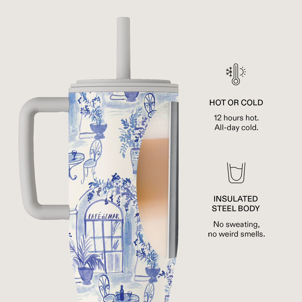 304L ruostumattomasta teräksestä valmistettu runko kestää käyttöä, ja BPA-vapaista materiaaleista valmistettu kansi on turvallinen arjen juomakäyttöön. Muotoilu on painettu, joten pinta pysyy näyttävänä ja tyylikkäänä. Muki on helppo puhdistaa - käsinpesu rungolle ja kannelle pesukoneen yläkori.