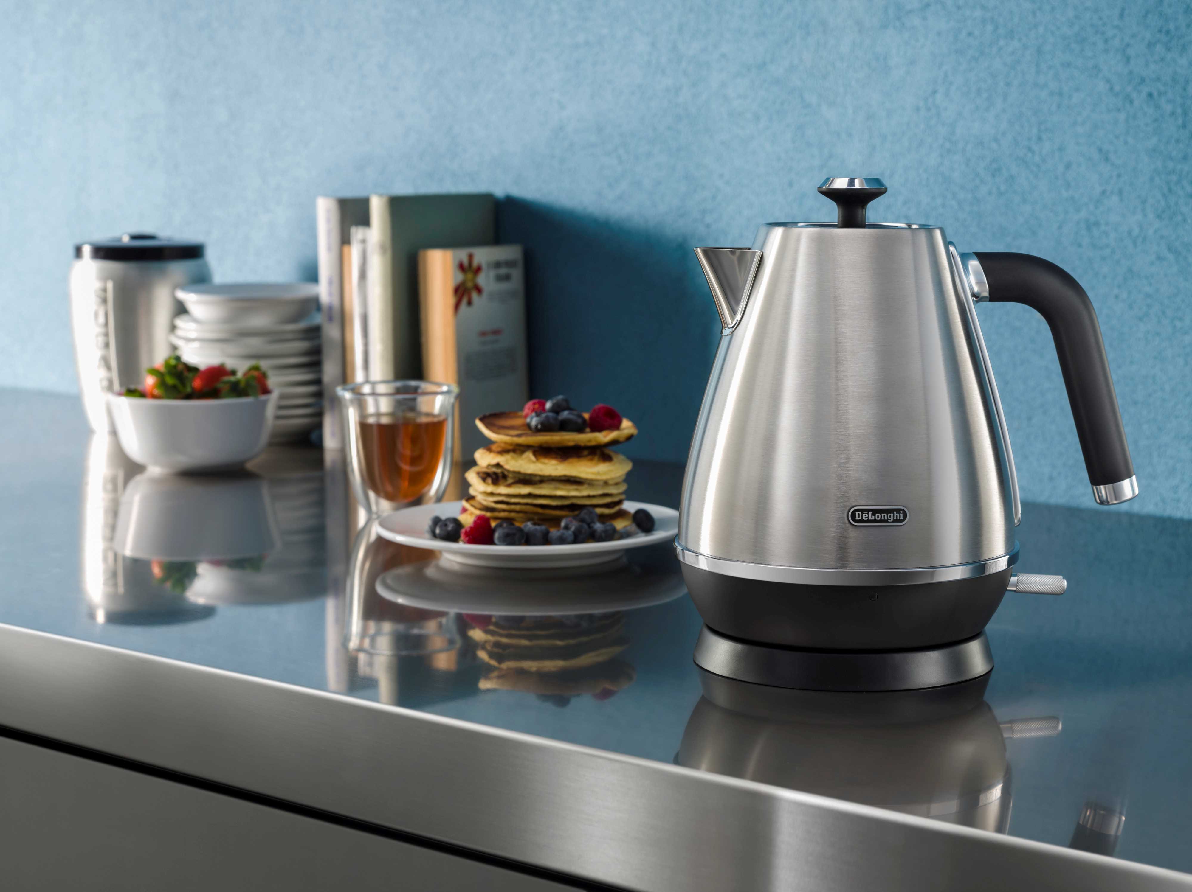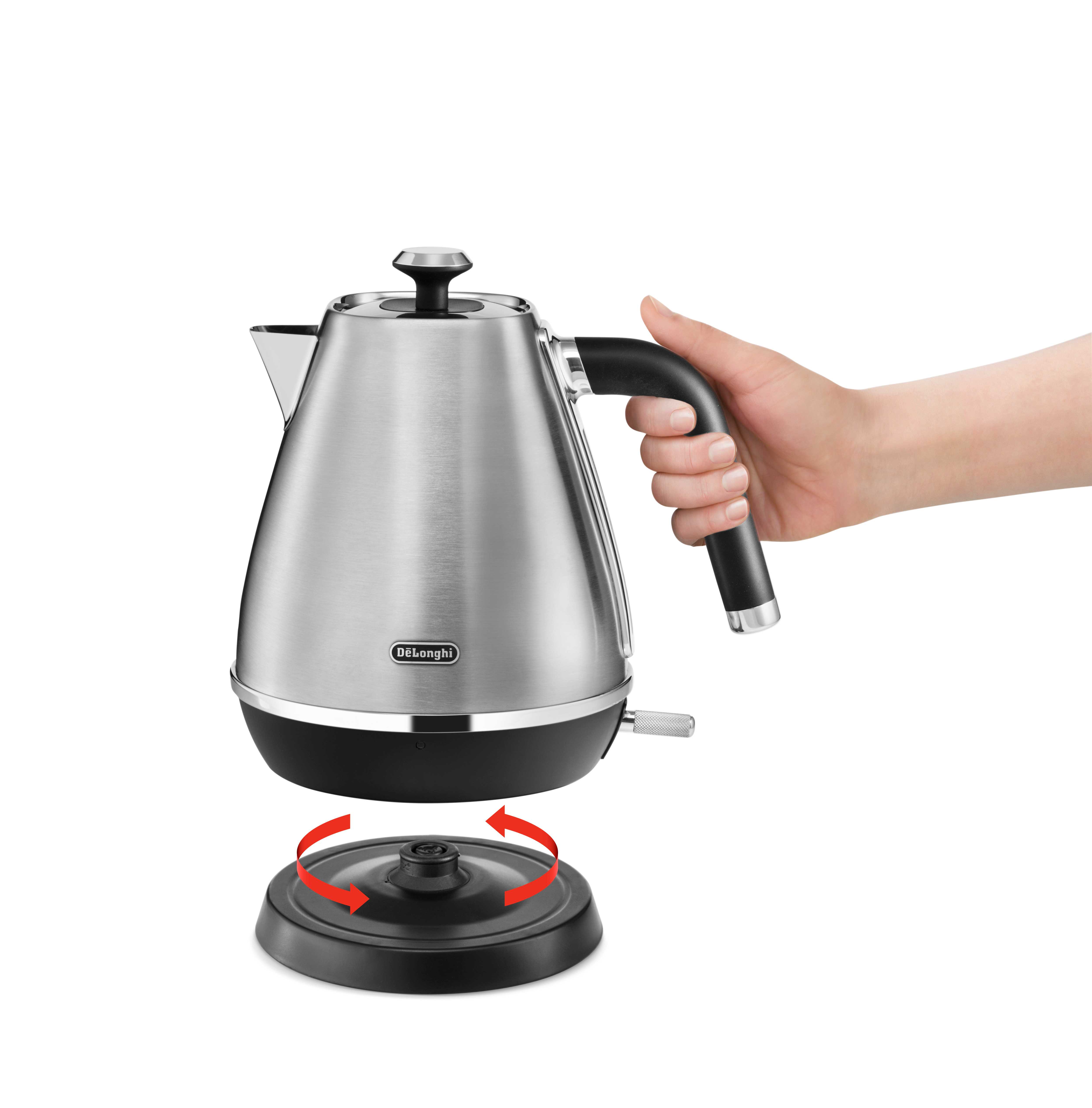 Kauniilla De?Longhi Distinta X vedenkeittimellä keität kerralla enintään 1,7 litraa vettä. Teräsrunkoinen keitin pyörii jalustassaan esteettä ja johdoton kannu on helppo nostaa pöytään. Tyylikkään Distinta X vedenkeittimen pinta on harjattua terästä ja selkeä vedentason näyttö helpottaa keittimen täyttämistä. Keittimessä on kolminkertainen turvajärjestelmä: keitin sammuu veden alkaessa kiehumaan, kun kannu nostetaan irti jalustastaan tai kun keittimessä on liian vähän vettä. Irrotettava ja pestävä kalkinsuodatin lisää hygienisyyttä ja tukeva kahva pysyy hyvin otteessa. Teho 2000 W. Takuu 2 vuotta.