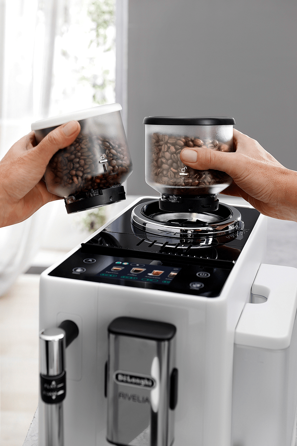 Kaksi papusäiliötä tarjoavan Bean Switch -järjestelmän ansiosta voit vaihtaa ja tutkia helposti erilaisia papuvaihtoehtoja ja värilliseltä 3,5" hipaisunäytöltä helposti hallittava Bean Adapt -teknologia mukauttaa automaattisesti Espresson jauhatustason, kahviannoksen ja uuttamislämpötilan valitsemiesi papujen mukaan. Halutessasi voit valmistaa kahvia myös kahvijauheesta. Irrotettava kahvijauhesuppilo ja kahvijauheen mittalusikka löytyvät laitteen päällä sijaitsevasta kätevästä säilytyslokerosta.