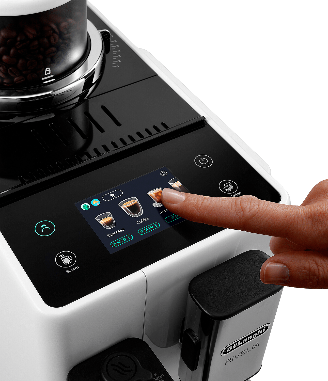 Neljän nimettävän käyttäjäprofiilin taakse jokainen käyttäjä voi muokata lempikahvinsa omia mieltymyksiään vastaavaksi MY-toiminnon avulla. Sukella Rivelian värillisen hipaisunäytön maailmaan ja pyyhkäise laajan reseptivalikoiman läpi! De?Longhi Coffeeroutine ?toiminnon avulla Rivelia muistaa millaisesta kahvista pidät päivän kuluessa ja päivittää juomaluettelosi kotinäytöllesi sen mukaan.