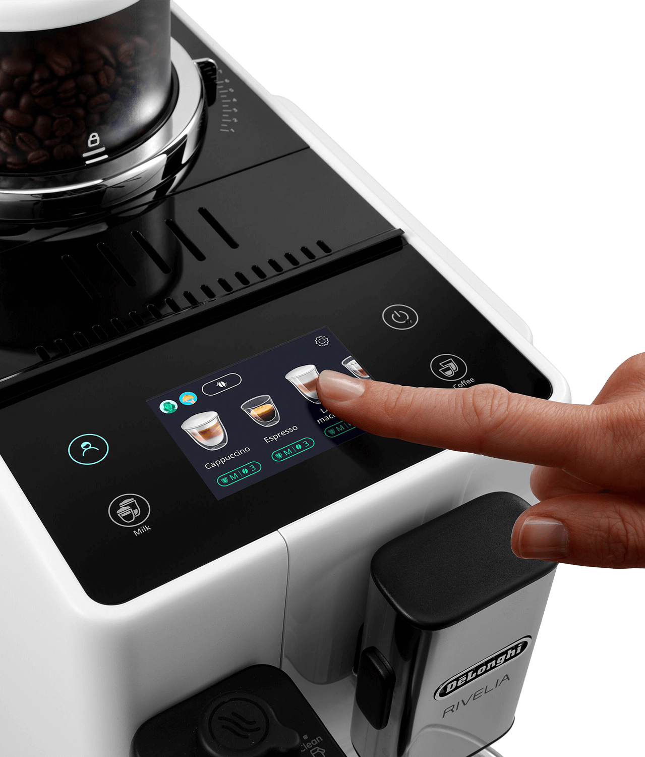 Neljän nimettävän käyttäjäprofiilin taakse jokainen käyttäjä voi muokata lempikahvinsa omia mieltymyksiään vastaavaksi MY-toiminnon avulla. Sukella Rivelian värillisen hipaisunäytön maailmaan ja pyyhkäise laajan reseptivalikoiman läpi! De Longhi Coffeeroutine -toiminnon avulla Rivelia muistaa millaisesta kahvista pidät päivän kuluessa ja päivittää juomaluettelosi kotinäytöllesi sen mukaan.