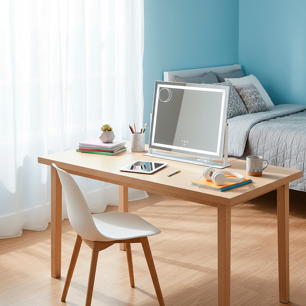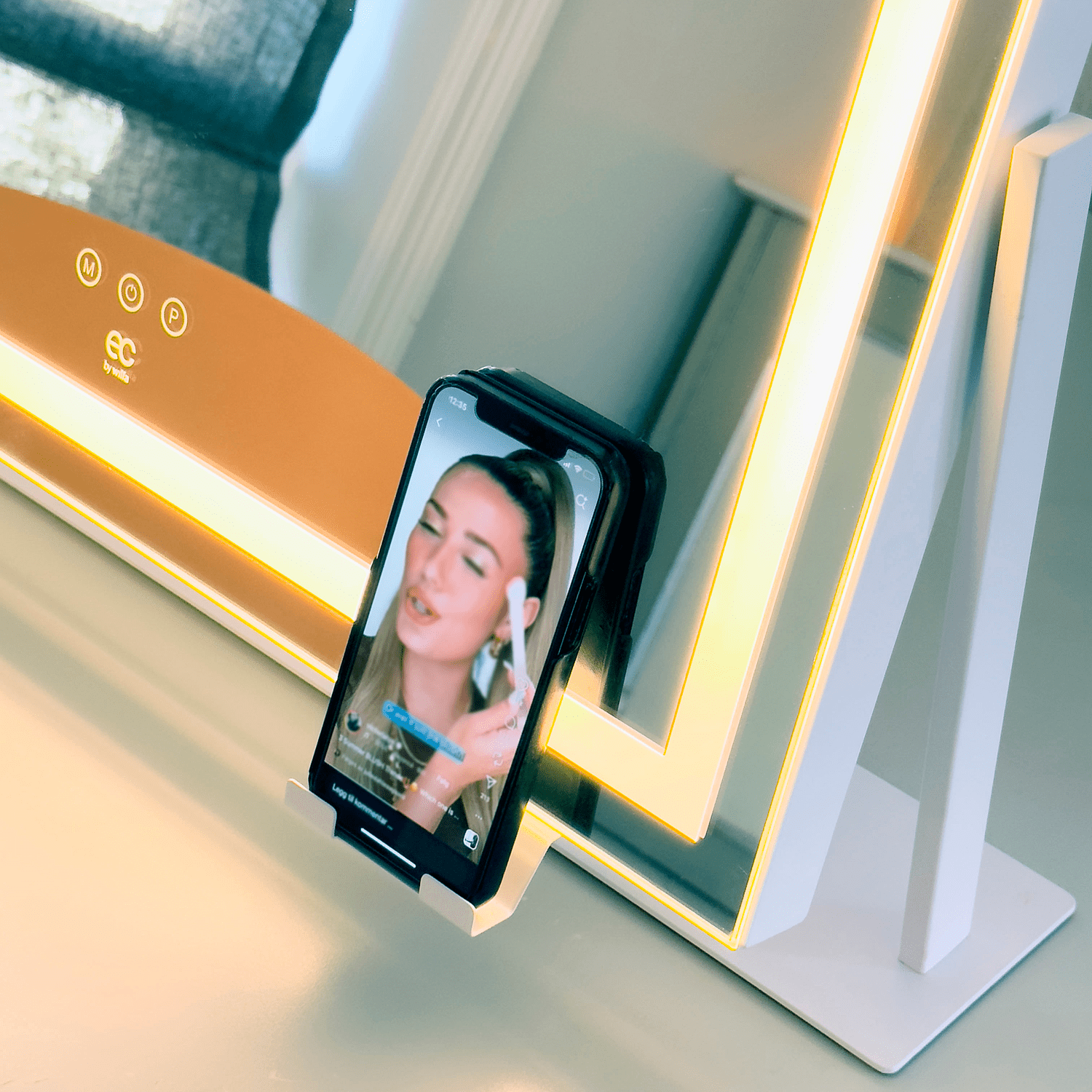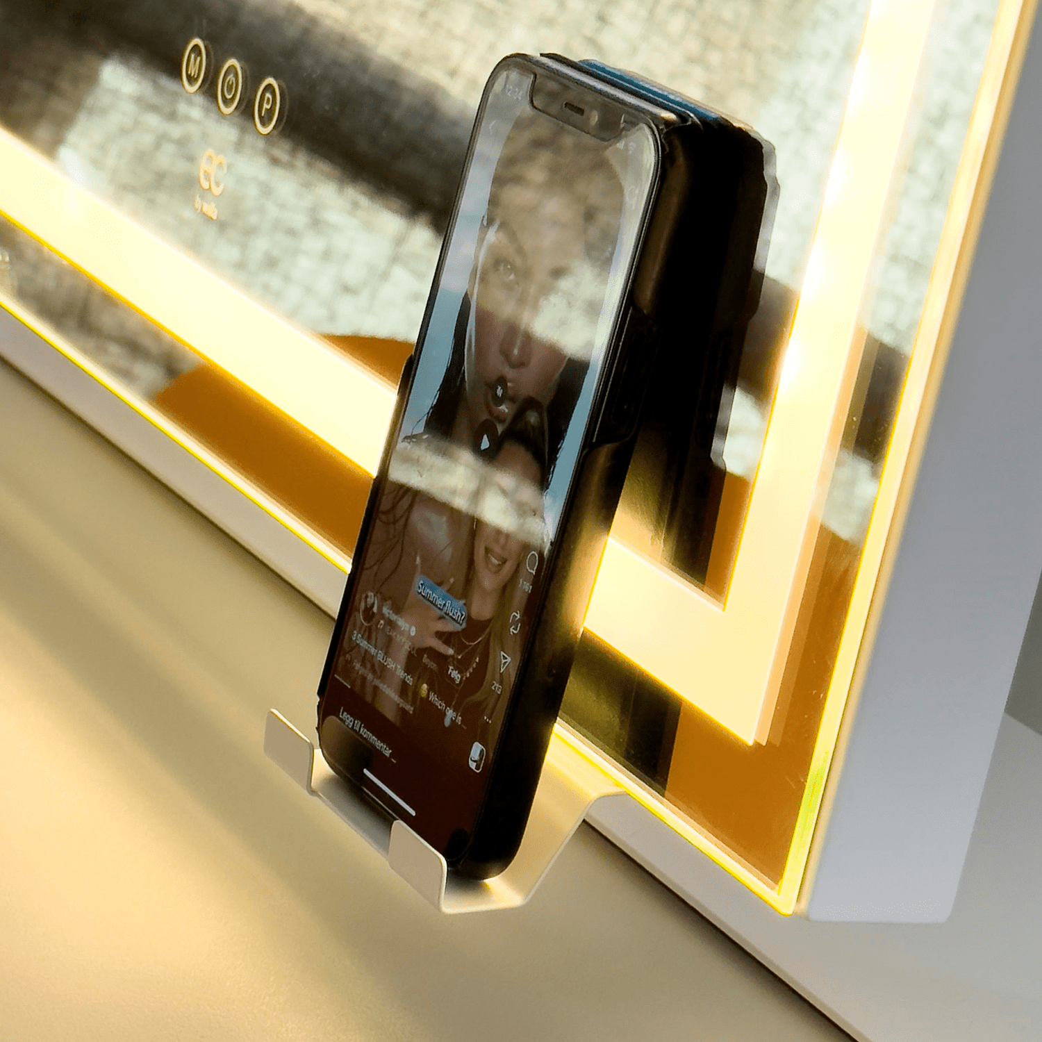 Sisäänrakennetut USB-A ja USB-C-lähtöportit mahdollistavat laitteiden lataamisen valmistautumisen aikana. Puhelinteline kiinnittyy peiliin, joten voit seurata ohjeita tai viihdettä samalla kun laittaudut.