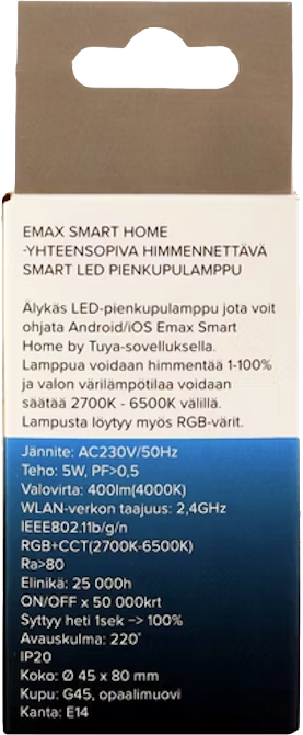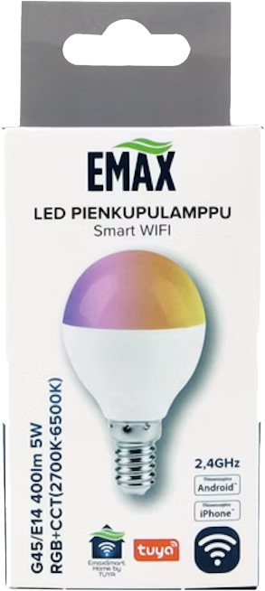 Älykäs Emax Smart Home LED-pienkupulamppu G45/E14 on erinomainen lisä kodin tunnelmanluojaksi. Voit hallita lamppua Emax Smart Home -mobiilisovelluksella mistä tahansa, sytyttää ja sammuttaa valon, säätää värilämpötilaa 2700-6500K sekä himmentää valoa 1-100 % välillä suoraan puhelimestasi. Sovellus tukee sekä iOS- että Android-käyttöjärjestelmiä, ja lampun elinikä on 25 000 tuntia.