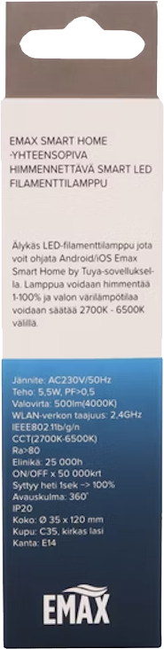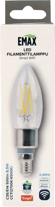 Älykäs Emax Smart Home LED-filamenttilamppu C35/E14 on erinomainen lisä kodin tunnelmanluojaksi. Voit hallita lamppua Emax Smart Home -mobiilisovelluksella mistä tahansa, sytyttää ja sammuttaa valon, säätää värilämpötilaa 2700-6500K sekä himmentää valoa 1-100 % välillä suoraan puhelimestasi. Sovellus tukee sekä iOS- että Android-käyttöjärjestelmiä, ja lampun elinikä on 25 000 tuntia.