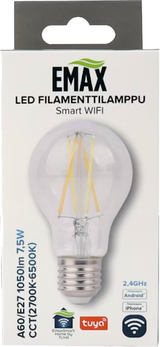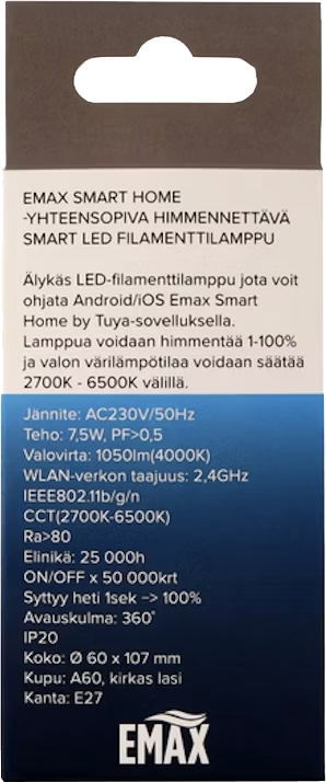 Älykäs Emax Smart Home LED-filamenttilamppu A60/E27 on erinomainen lisä kodin tunnelmanluojaksi. Voit hallita lamppua Emax Smart Home -mobiilisovelluksella mistä tahansa, sytyttää ja sammuttaa valon, säätää värilämpötilaa 2700-6500K sekä himmentää valoa 1-100 % välillä suoraan puhelimestasi. Sovellus tukee sekä iOS- että Android-käyttöjärjestelmiä, ja lampun elinikä on 25 000 tuntia.