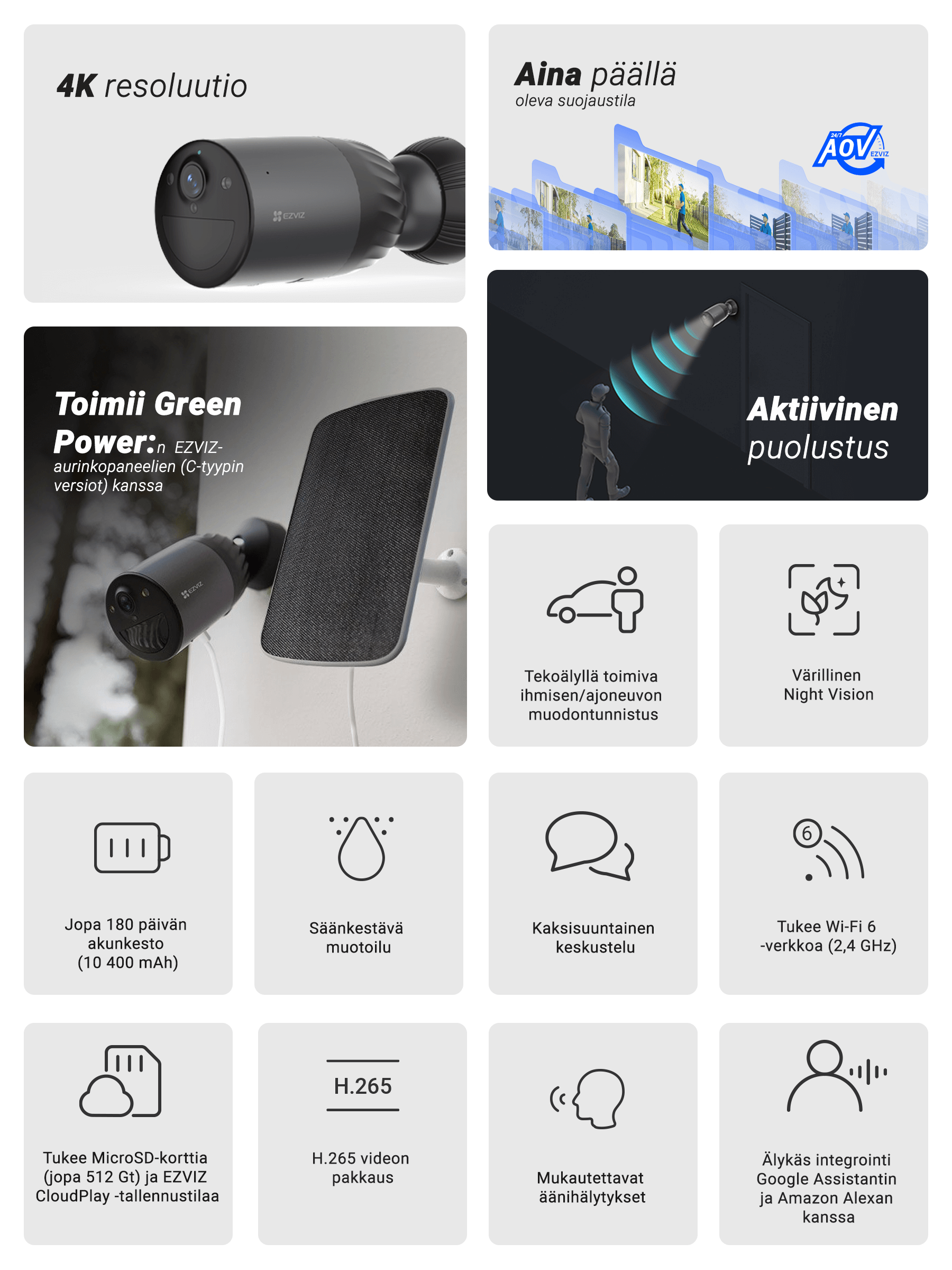 EZVIZ AOV -tila on mullistava teknologia, joka varmistaa automaattisen ja jatkuvan valvonnan. Aktivoitumalla ajoitetuin väliajoin, tämä älykamera käynnistää älykkään liikkeentunnistuksen ja tallentaa kaikki tärkeät hetket jatkuvan turvallisuuden takaamiseksi.