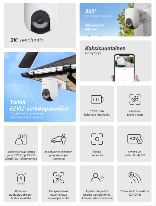 Wi-Fi 6 -tuki takaa vakaan ja nopean yhteyden myös ulkotiloissa. Kameraa voi ohjata helposti EZVIZ-sovelluksella tai äänikomennoilla, ja kaksisuuntainen ääni mahdollistaa keskustelun vierailijoiden kanssa reaaliajassa.