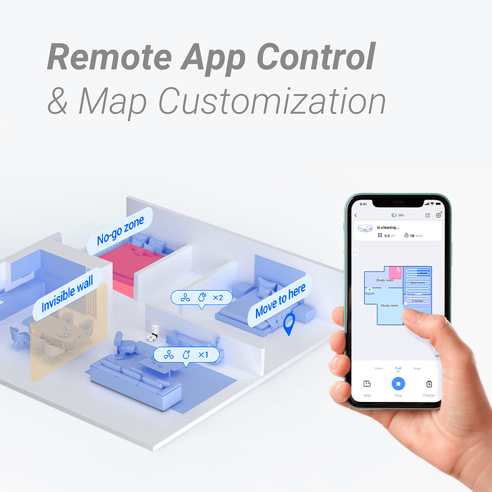 Älä huolehdi siitä, että robottipölynimuri törmää kotisi karvaisiin ystäviin. RE5S Plus on varustettu LDS-LiDAR- ja infrapuna-antureilla, joten se voi helposti välttää esteitä ja löytää parhaan puhdistusreitin jopa ahtaissa tiloissa. Kartoittamalla kotisi RE5S Plus tarjoaa sinulle henkilökohtaisen siivouskokemuksen, joka sopii täydellisesti tilaasi. EZVIZ-sovelluksella voit helposti mukauttaa pohjapiirroksia eri alueille tai huoneille tai määrittää siivoustehtäviä koko kotiisi.