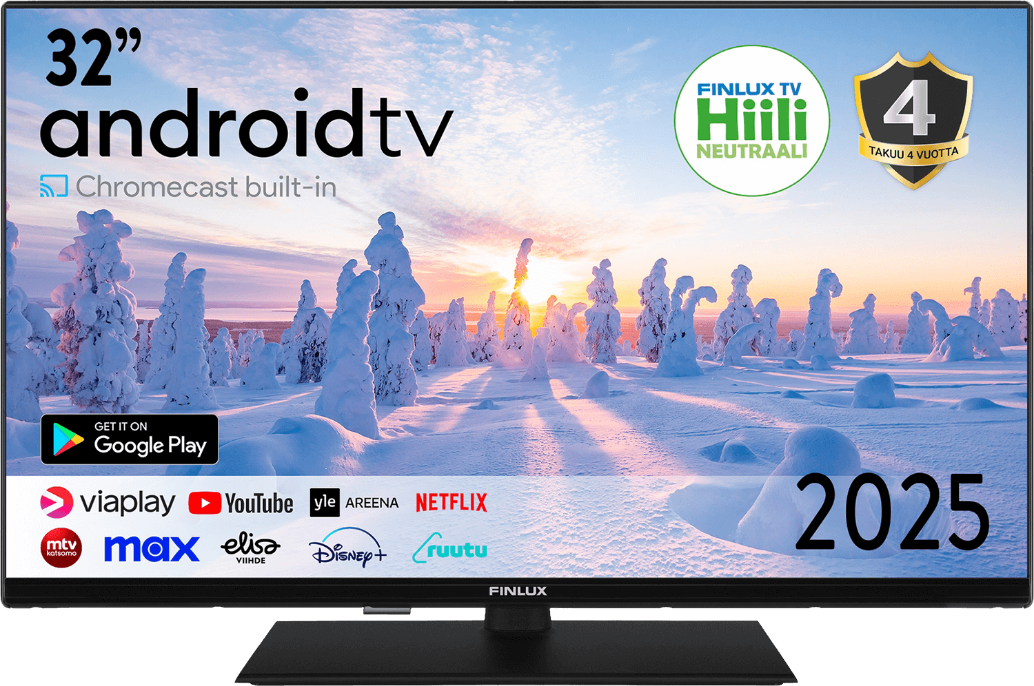 FINLUX 32G8.2ECI on 32" Smart Android-Televisio, jossa yhdistyvät miellyttävä ja tarkka kuva , moderni design, uusin tekniikka sekä helppokäyttöisyys ja huima 4 vuoden takuu!