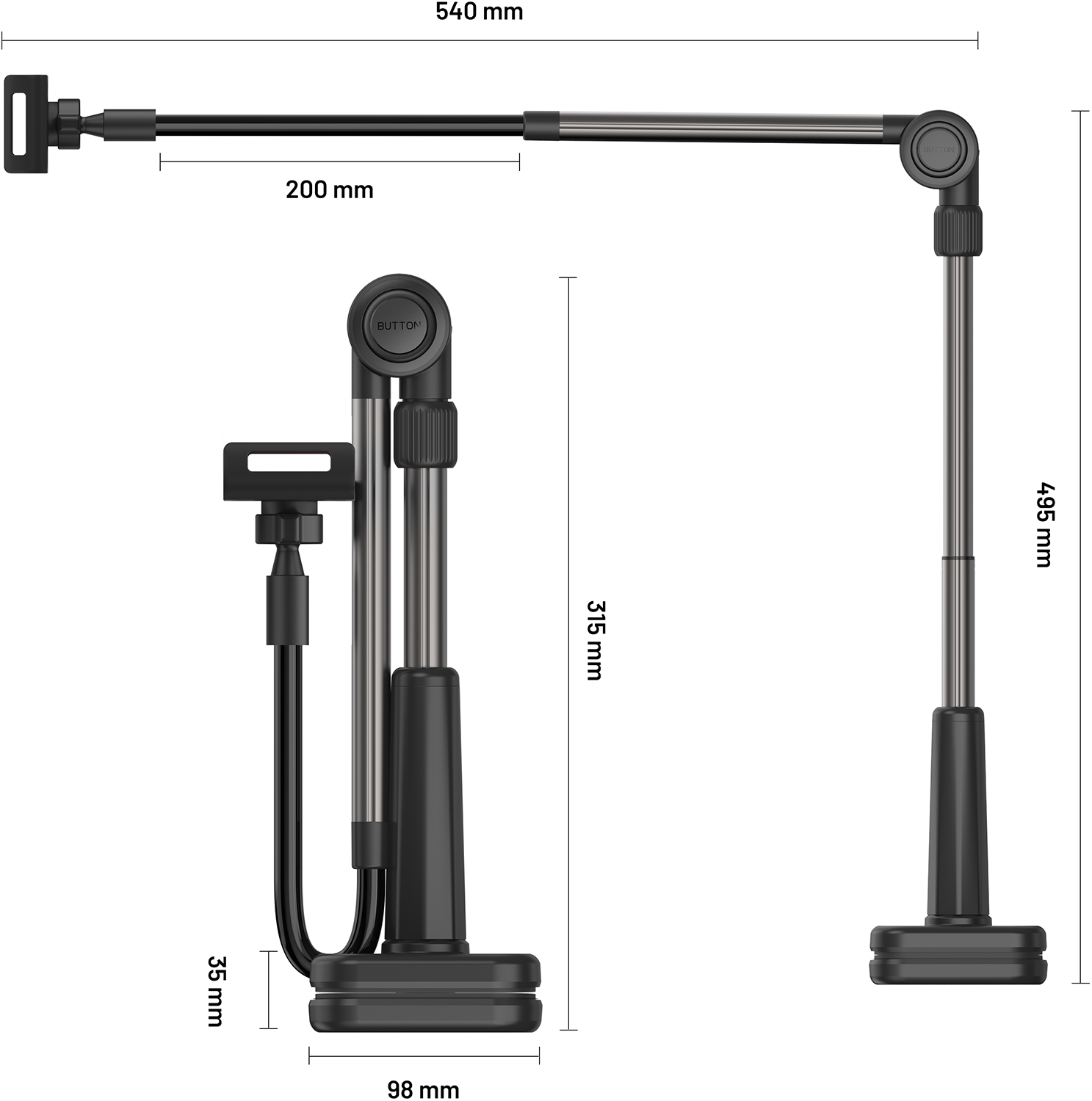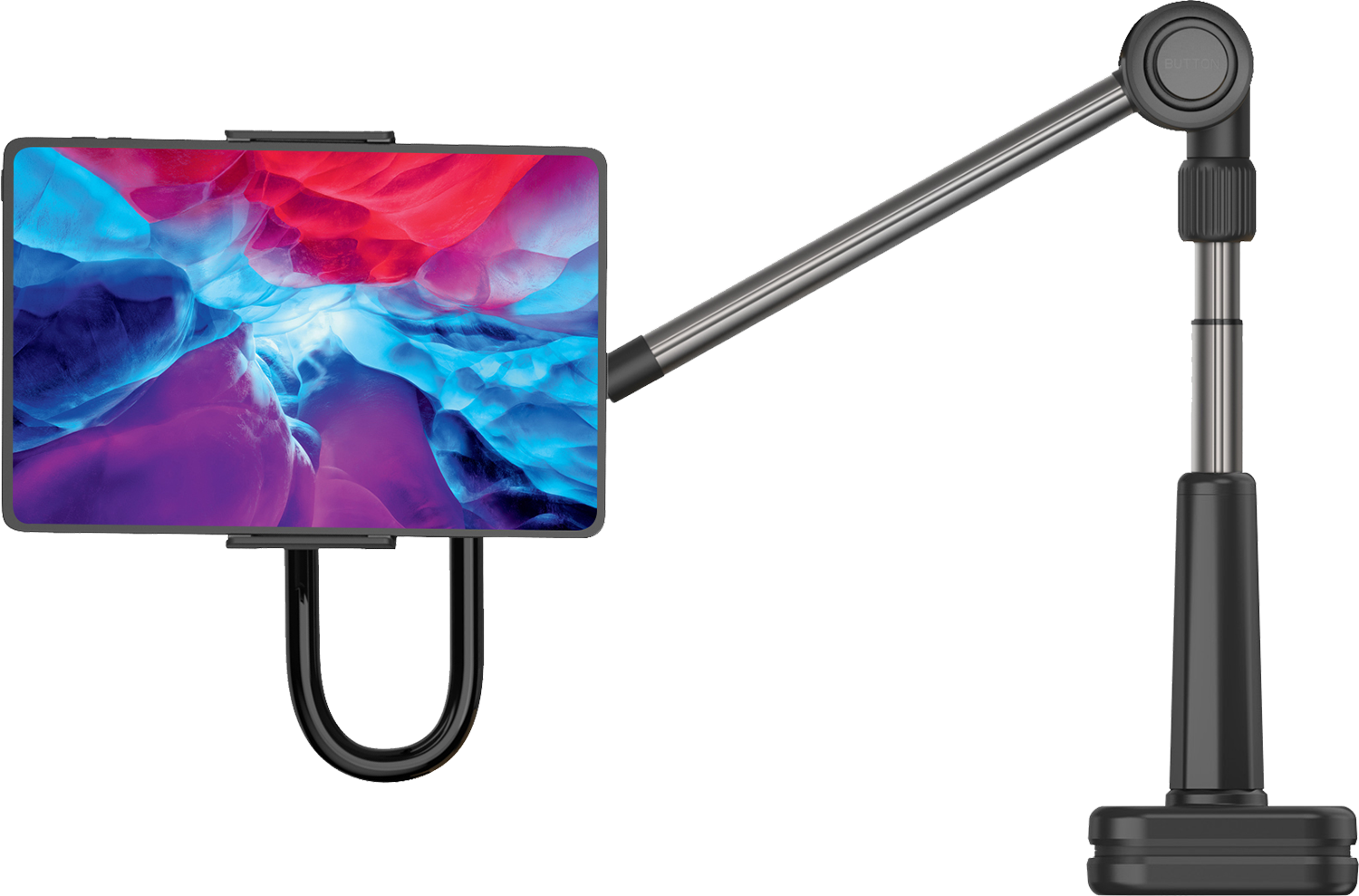 Pidike on suunniteltu kaikille laitteille, joiden koko on 7 - 13 tuumaa. Siinä on pikakiinnikkeet kiinnitystä varten, sisäinen pehmuste ja 360 astetta kääntyvä pää. Pitimen varsi on valmistettu korkealaatuisesta alumiinista ja koostuu useista säädettävistä osista. Sitä voidaan säätää ja kiinnittää kahdelle eri korkeudelle, kallistaa tarpeen mukaan ja hanhenkaulalla viimeistä osaa voidaan säätää pitämään tablettisi tai puhelimesi mukavasti näkyvillä.