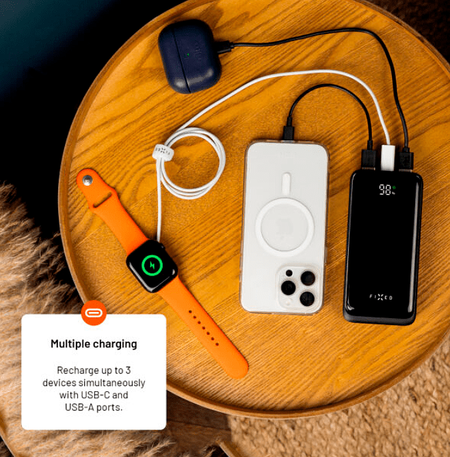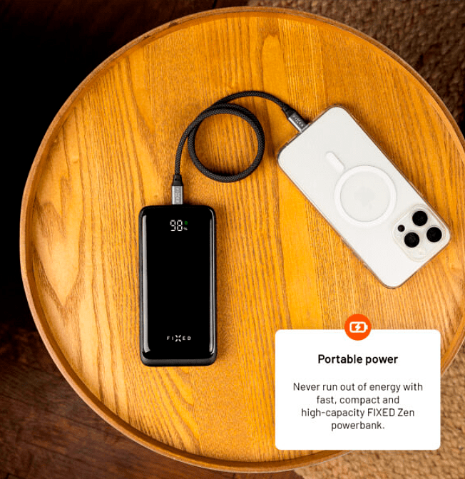 Kompakti ja nopea virtapankki FIXED Zen 20 toimii varavirtalähteenä matkapuhelimelle, tabletille, kuulokkeille ja muulle elektroniikalle. Lataamista varten virtapankki on varustettu yhdellä USB-C:llä ja parilla USB-A-portteja, joten se voi ladata jopa kolmea laitetta samanaikaisesti. Kun USB-C-portti on kytketty, virtapankki käynnistää välittömästi PD-pikalatauksen täydellä 20 W teholla. Täydellä 20 000 mAh:n kapasiteetilla voit ladata nykyaikaiset älypuhelimet jopa useita kertoja. Akun rungossa oleva LCD-näyttö ilmoittaa virtapankissa jäljellä olevan virran tarkan määrän. Suuresta kapasiteetistaan huolimatta varavirtalähde yllättää kompaktilla kokollaan, se mahtuu helposti taskuun tai reppuun. FIXED Zen 20 -virtapankin avulla saat tarpeeksi virtaa matkalla ja pääset eroon laitteidesi akun tilaa koskevista ikuisista huolista.