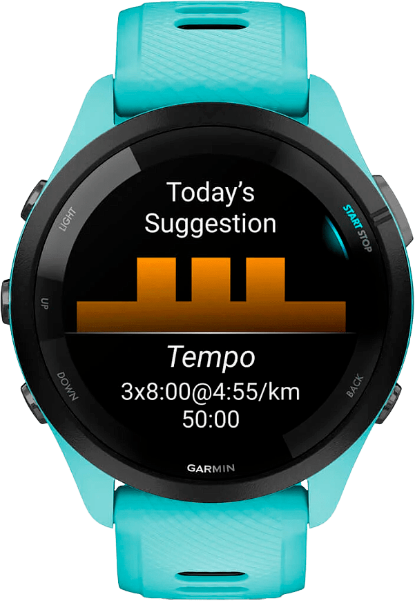 Forerunner 265 tarjoaa laajan valikoiman harjoitusohjelmia ja urheilusovelluksia, jotka tarjoavat kattavat harjoittelu- ja harjoitusominaisuudet. Yli 30 aktiivisuusprofiilin ansiosta saat tilapäivityksiä ja yksityiskohtaisia tietoja harjoittelun aikana suoraan ranteeseesi. Race Widget auttaa sinua suunnittelemaan kilpailustrategian ja tarjoaa henkilökohtaisia harjoituksia kilpailusyötteiden perusteella. Se tarjoaa vinkkejä ja päivittäisiä treeniohjeita sekä ennakoidun valmistumisajan kilpailulle, sään, kuntosuoritusarvot ja paljon muuta, mikä pitää sinut motivoituneena. Acute Load -toiminto vertailee viimeisimpiä harjoituksiasi ja tarjoaa vinkkejä optimaalisesta alueesta, kun taas Garmin Coach toimii henkilökohtaisena valmentajanasi mukautuvien harjoitussuunnitelmien ja henkilökohtaisten harjoitusten avulla. Lisäksi ranteeseen perustuva juoksudynamiikka tuottaa laajan juoksuraportin, jossa on tietoa juoksutehostasi, maakosketusajasta, askelpituudesta ja muusta.