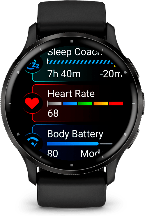 Tunne itsesi aidosti Garmin Venu 3 -älykellojen ansiosta. Laadukkaat valmentajat ranteessa on suunniteltu tukemaan tavoitteitasi. GPS-älykelloissa on edistykselliset hyvinvointi- ja kuntoiluominaisuudet nimenomaan parantamaan ymmärrystäsi kehostasi. Body Battery -energianseurannalla voit tarkkailla energiatasoasi, ja saat henkilökohtaista tietoa esimerkiksi unen, torkkujen, stressin ja harjoitusten perusteella. Paranna unesi laatua henkilökohtaisen univalmentajan ja torkkujen tunnistuksen avulla. Avuksi saat myös lisää tietoja, kuten sykevaihtelun tilan (annetut tiedot ovat tarkahko arvio seurattavista mittauksista).