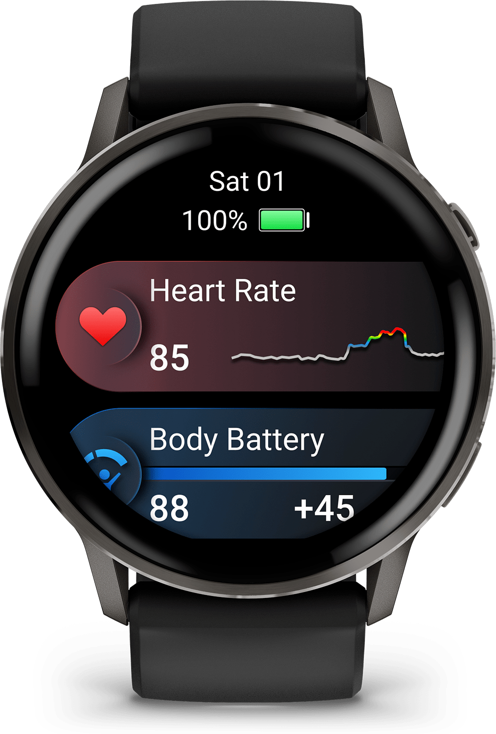 Edistä entistä terveellisempää elämäntyyliä kattavilla terveydentilan seurantaominaisuuksilla, joita ovat Body Battery -energianseuranta, stressi, pulssioksimetri1 sekä naisen terveyden seuranta, joka sisältää mm. menneiden ovulaatioiden arvioita, ja paljon muuta.