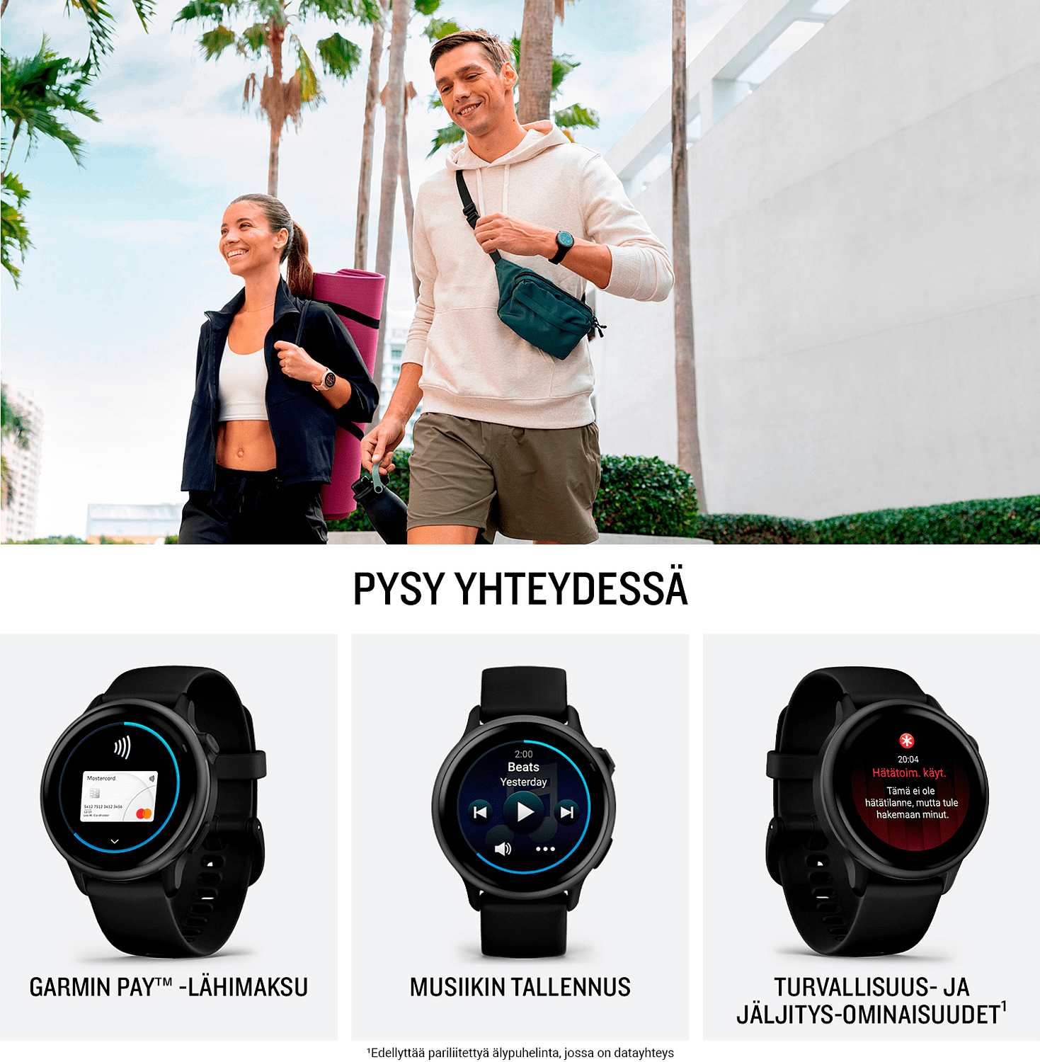 Lataa kelloon lempimusiikkiasi, kuten soittolistoja Spotifysta tai Deezeristä, ja yhdistämällä langattomat kuulokkeet voit kuunnella ilman puhelinta. Voit myös maksaa Garmin Pay -lähimaksulla ostoksia ja tietyissä liikennejärjestelmissä matkoja.