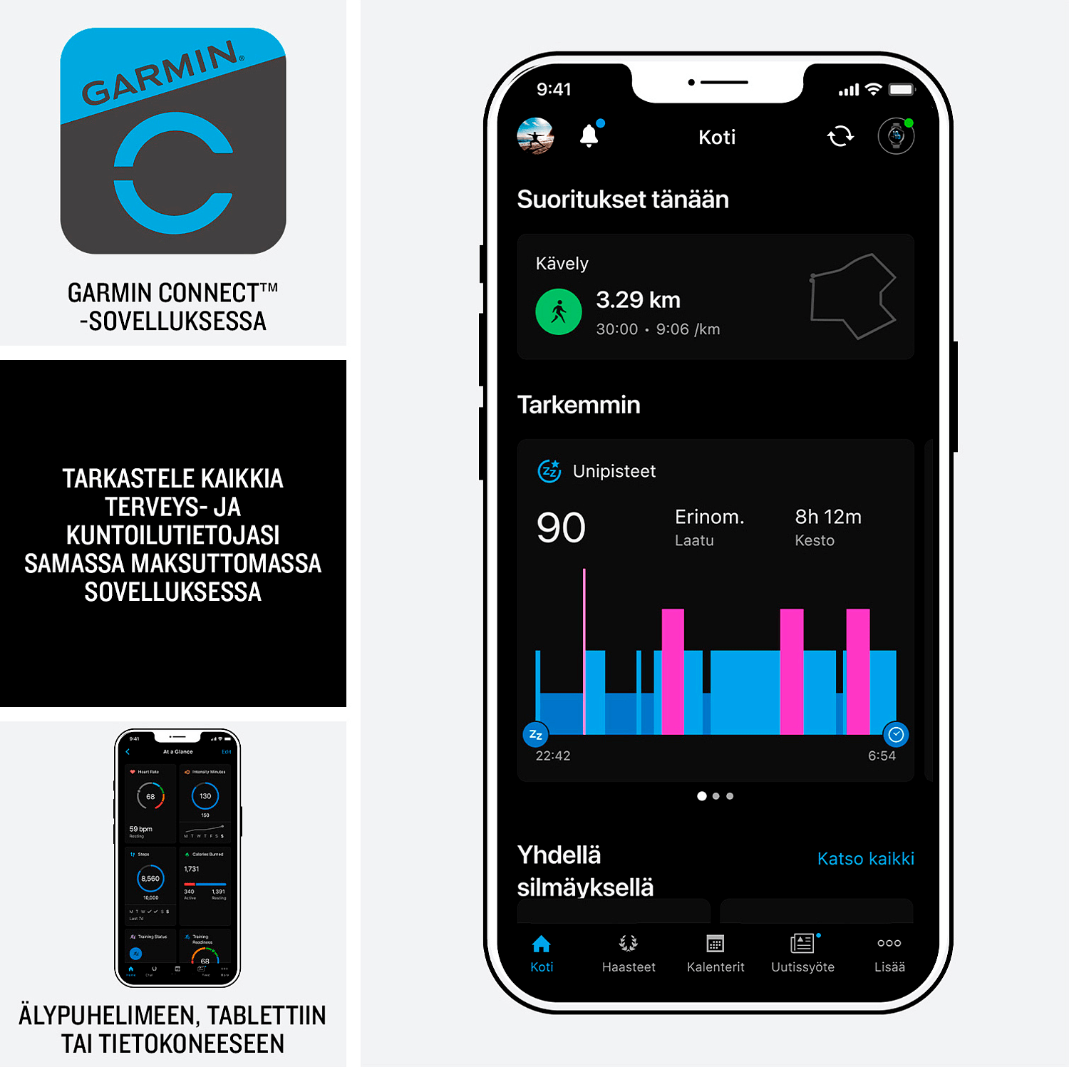 Garmin Connect? -älypuhelinsovelluksessa näet terveys- ja kuntotietosi, voit pitää yhteyttä ja kilpailla kaveriesi kanssa sekä rekisteröityä haasteisiin, joista voit ansaita kunniamerkkejä.