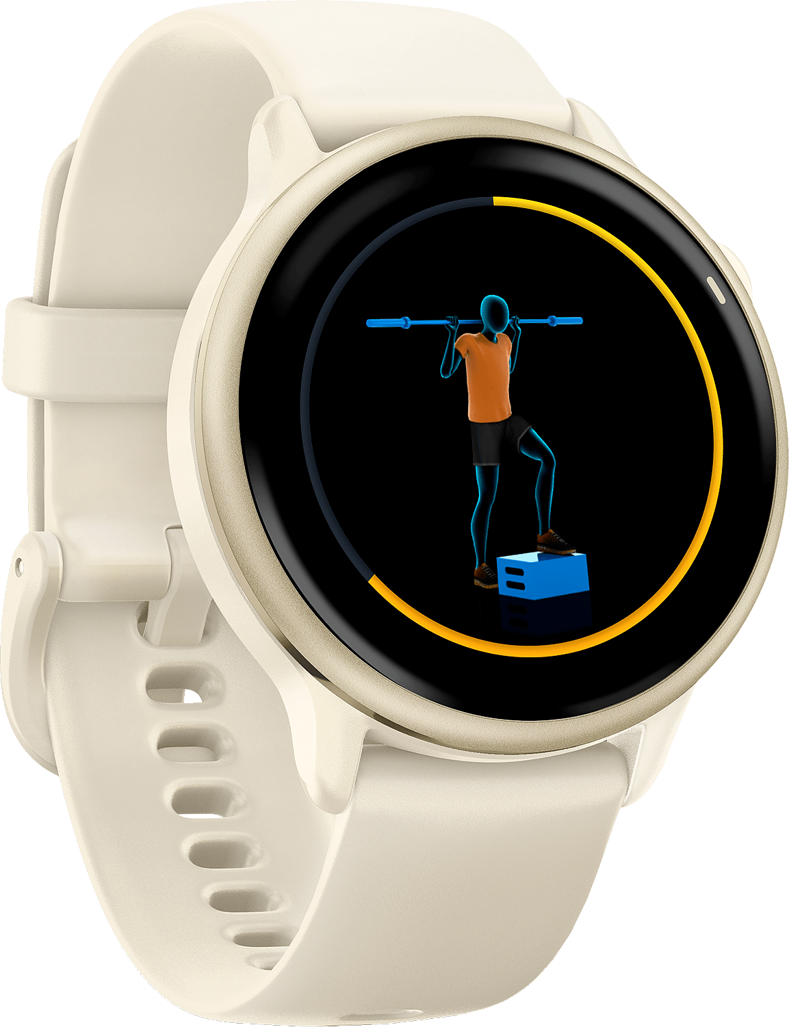 Kellossa on edistyksellisiä harjoitusominaisuuksia, kuten harjoituksen edun, joka ilmaisee kunkin harjoituksen vaikutusta kehoosi, ja palautumisajan, josta tiedät, missä ajassa kehosi palautuu. Animoidut kardio-, jooga-, voima-, HIIT- ja pilatesharjoitukset opettavat oikeita liikkeitä. Voit luoda omia harjoituksia Garmin Connect -älypuhelinsovelluksella tai kokeilla maksuttomia mukautettavia Garmin-valmentajan harjoitusohjelmia.