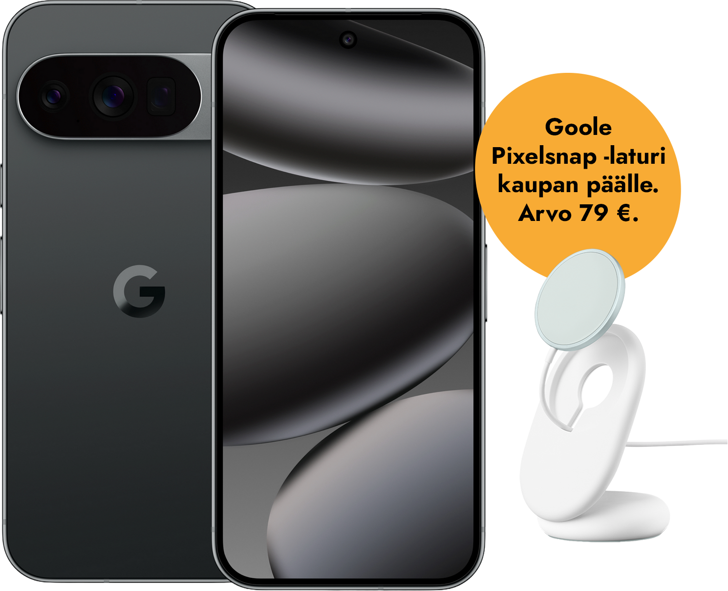 Ostaessasi Pixel 10 Pro -puhelimen 30.3.-19.4.2026 välisenä kampanja-aikana, saat Google Pixelsnap -laturin kaupan päälle. Edun arvo 79 €!