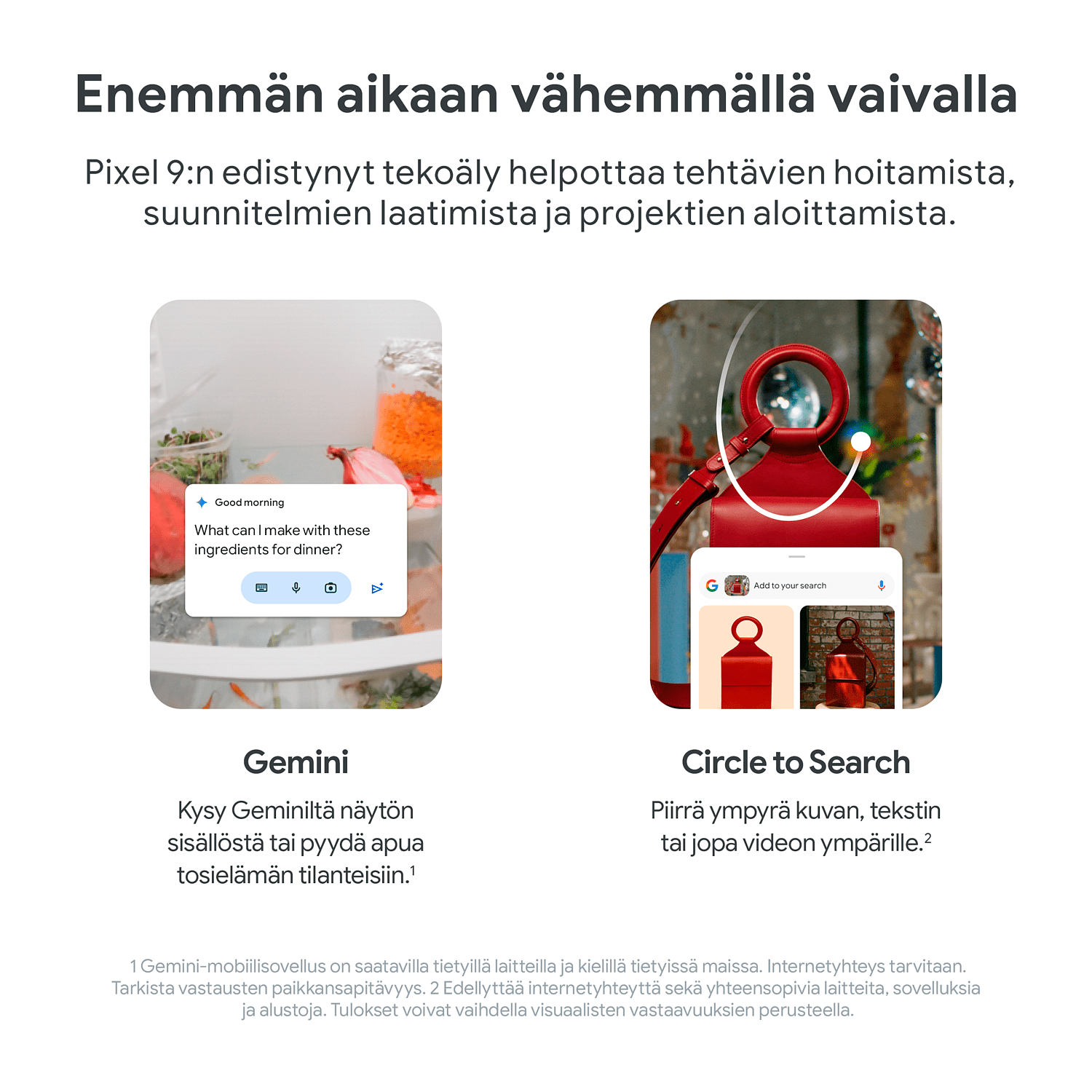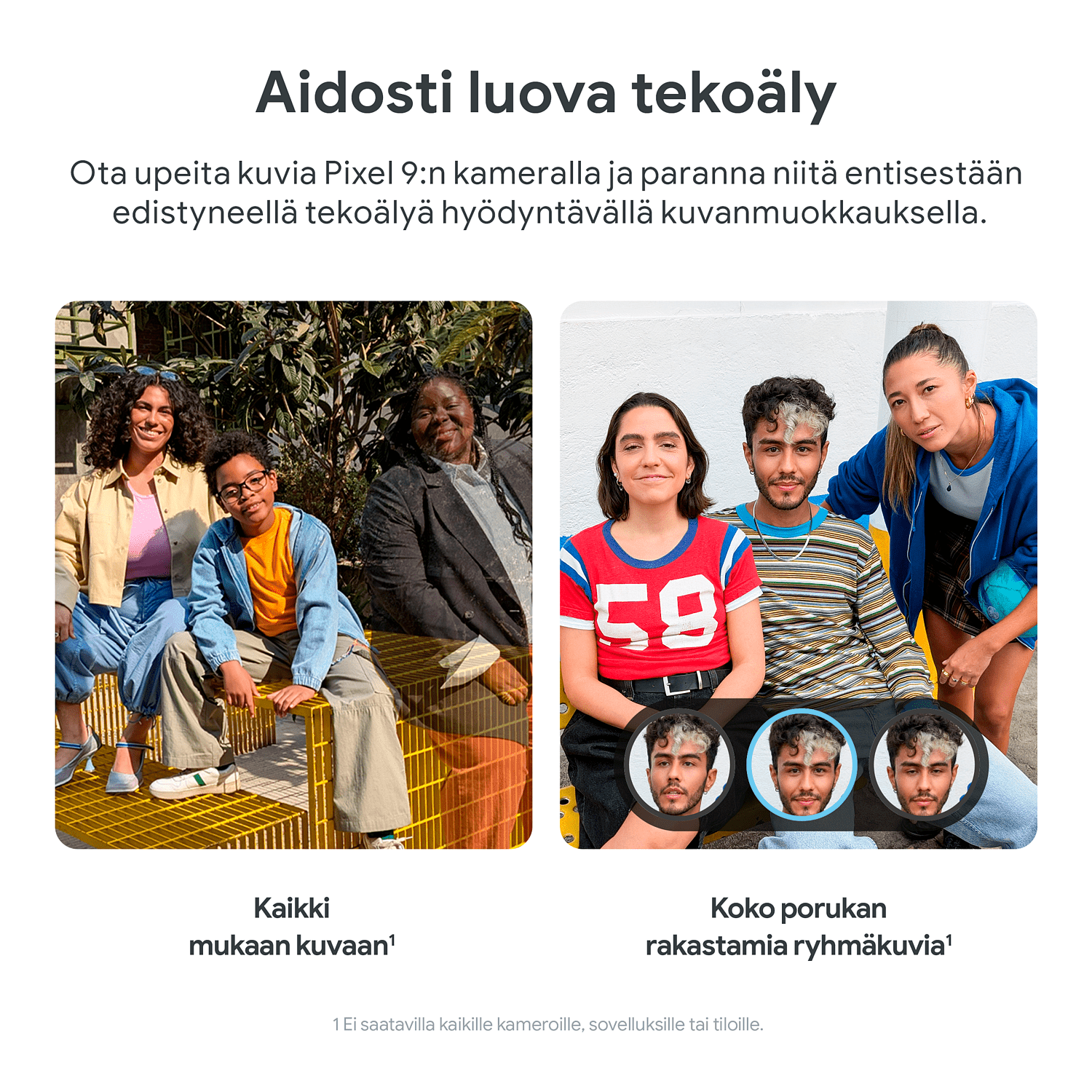 Fitbit Premium- ja YouTube Premium -kokeilutarjoukset ovat saatavilla kunkin palvelun ehdot täyttäville käyttäjille, jotka ostavat ja aktivoivat Pixel 9:n viimeistään 31.12.2025 23.59 EET. Google One Premium 2 Tt -tarjous on saatavilla uusille Google One -käyttäjille, jotka ostavat ja aktivoivat Pixel 9:n 31.10.2025 klo 23.59 EET mennessä ja lunastavat tarjouksen 15.11.2025 klo 23.59 EET mennessä. Rekisteröitymiseen tarvitaan voimassa oleva maksutapa, mutta Google One Premium 2 Tt -paketin kuukausimaksua 9,99 €, Fitbit Premiumin kuukausimaksua 8,99 € tai YouTube Premiumin kuukausimaksua 11,99 € ei veloiteta, ennen kuin niiden kokeilujaksot päättyvät. Peru milloin vain. Ostetun laitteen palauttaminen voi perua kaikki tilaukset. Fitbit Premiumin sisältö ja ominaisuudet voivat muuttua. Lue käyttöehdot kokonaisuudessaan osoitteista youtube.com/premium/restrictions, one.google.com/offer/terms-and-conditions/pixel9 ja g.co/fitbitpremium/tos.