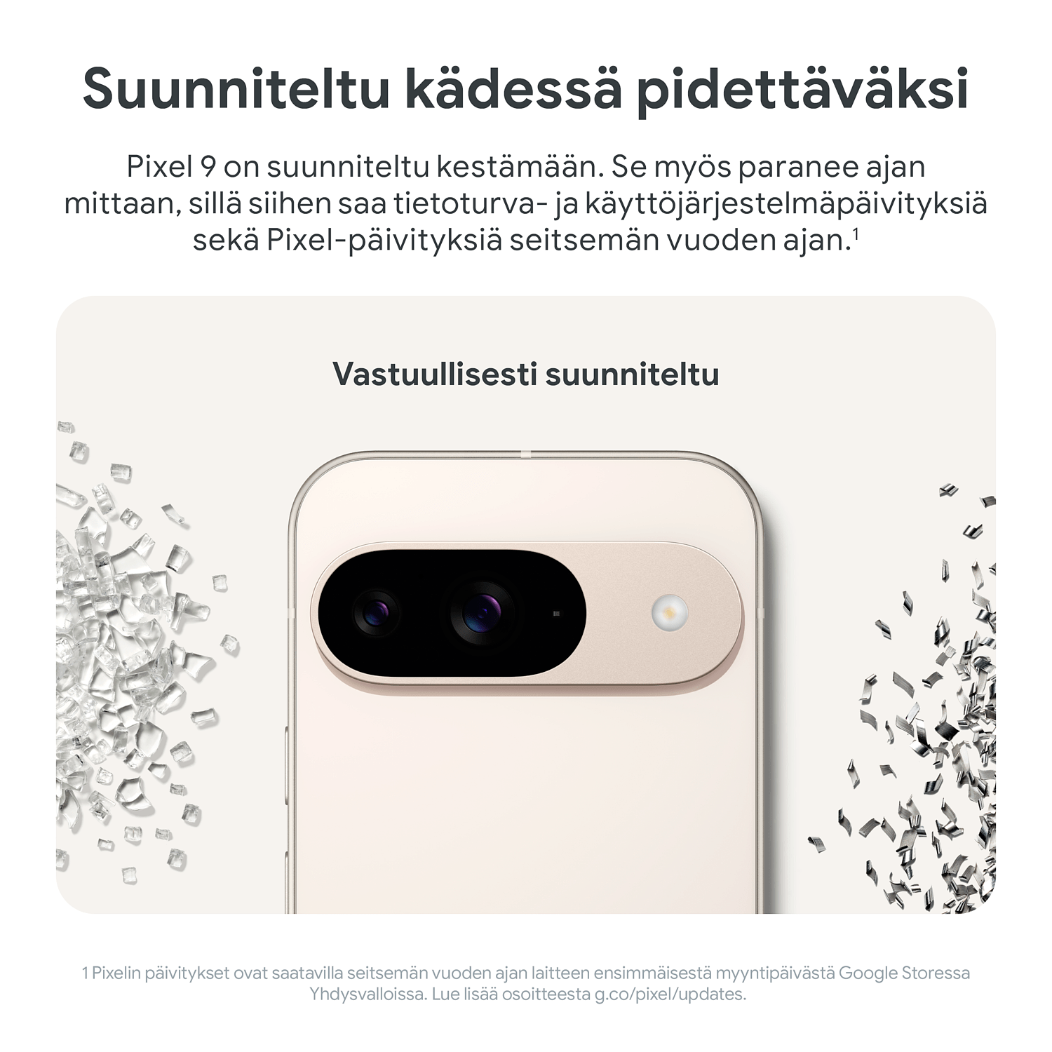 Pixel kestää pudotuksia, roiskeita ja pölyä. Sen Corning Gorilla Glass Victus 2 -näyttö on lisäksi naarmun- ja iskunkestävä.