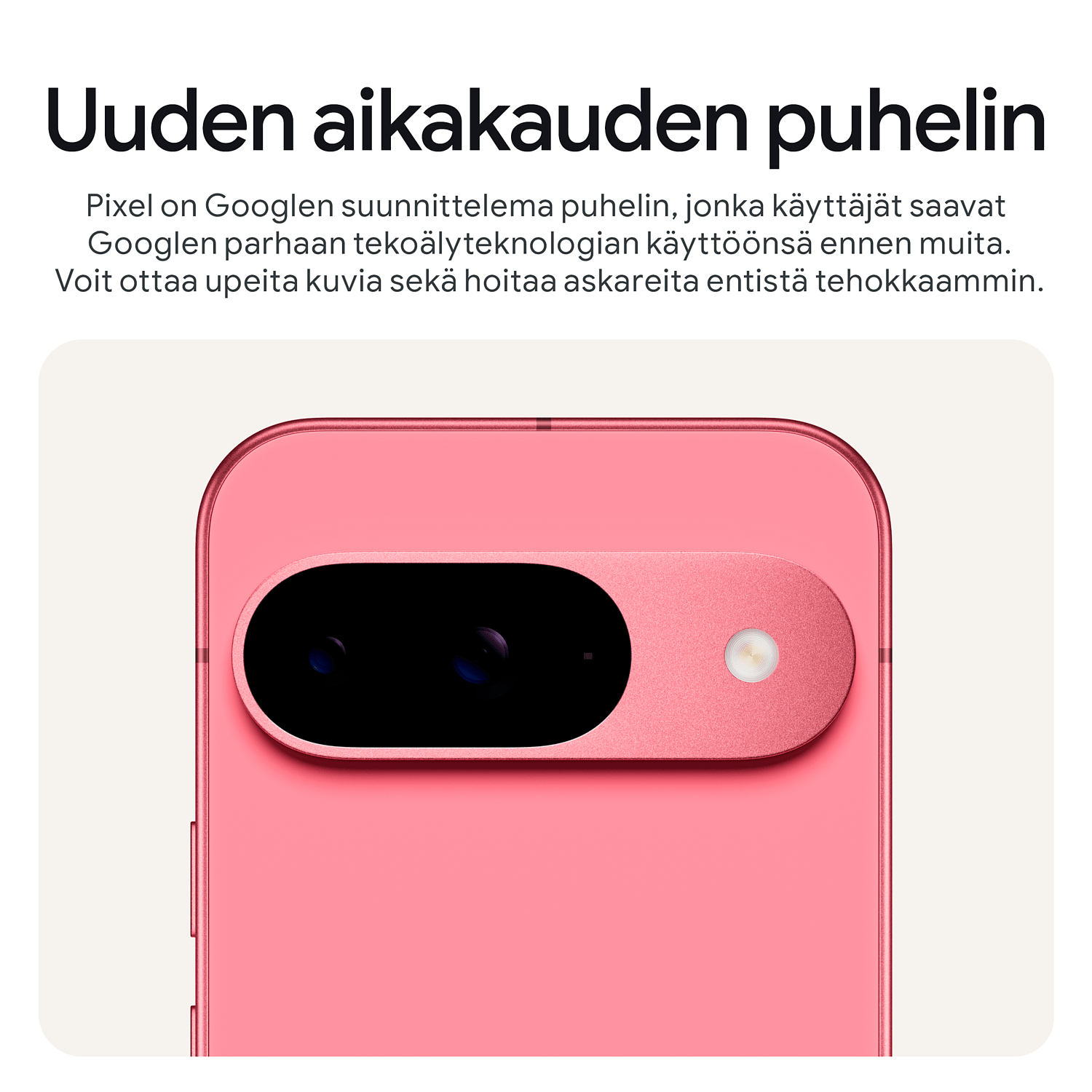 Geminillä varustettu Pixel 9 on Googlen suunnittelema puhelin, jonka käyttäjät saavat Googlen parhaan tekoälyteknologian käyttöönsä ennen muita. Voit ottaa upeita kuvia ja muokata niitä helposti sekä hoitaa askareita entistä tehokkaammin. Pixel voi suojata sinua roskasisällöltä ja muilta uhkilta ja auttaa hätätilanteessa. Se on myös suunniteltu kestämään.