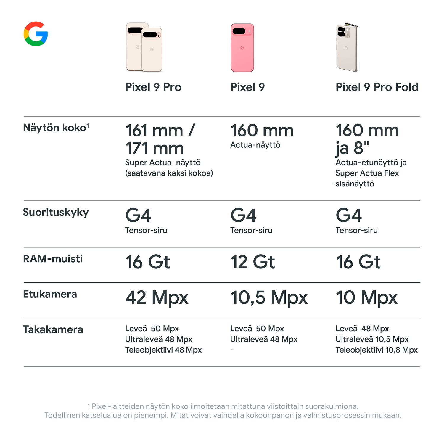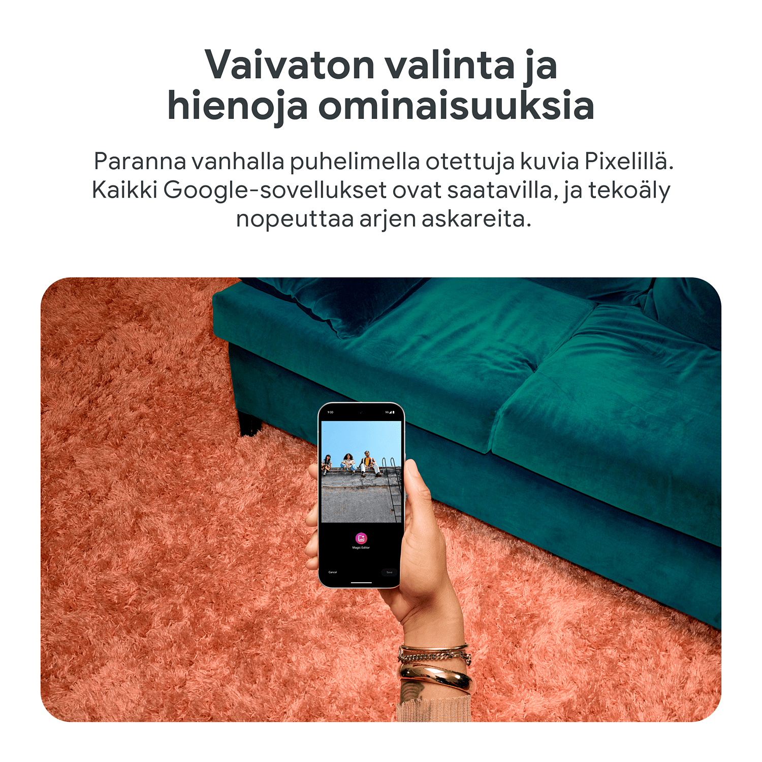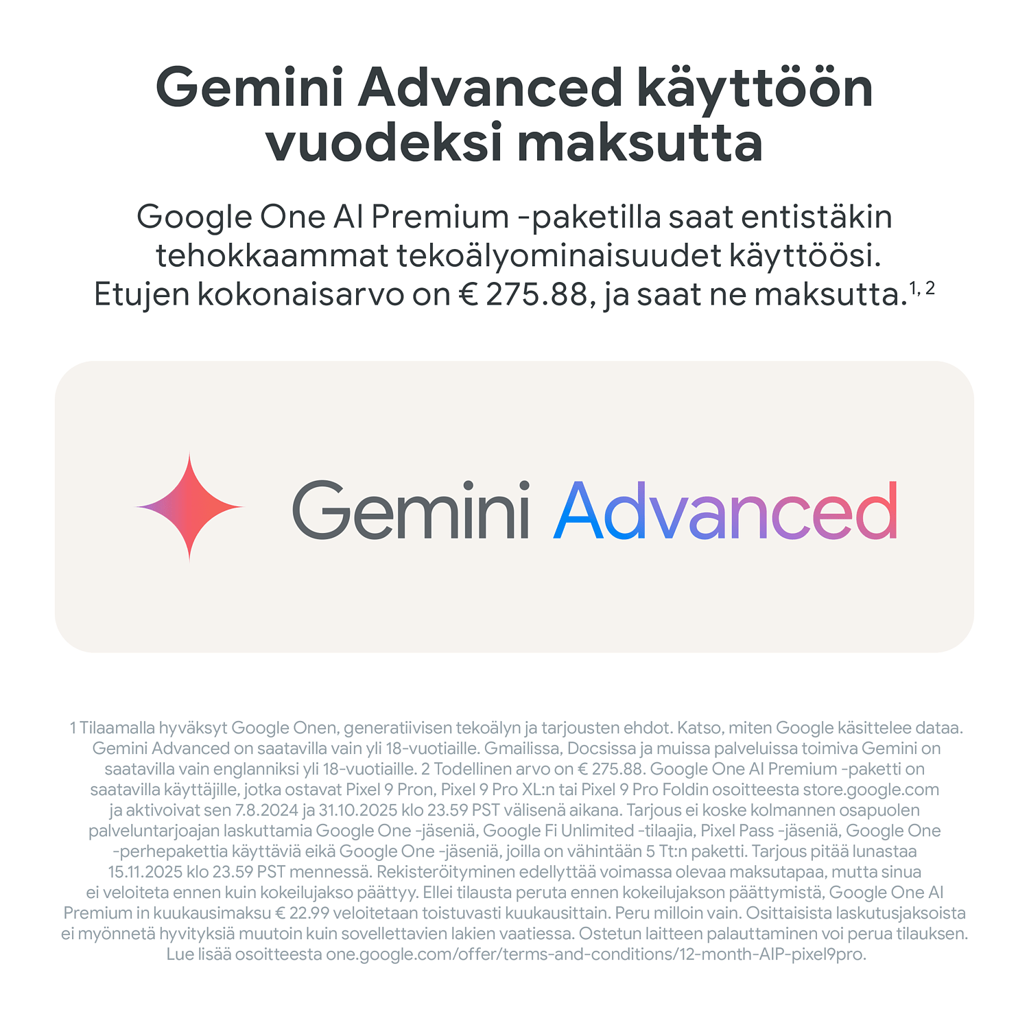 Google One AI Premium-, Fitbit Premium- ja YouTube Premium -kokeilutarjoukset ovat saatavilla kunkin palvelun ehdot täyttäville käyttäjille, jotka ostavat Pixel 9 Pron, Pixel 9 Pro XL:n tai Pixel 9 Pro Foldin ja aktivoivat sen viimeistään 31.10.2025 (Google One AI Premium -tarjous) tai viimeistään 31.12.2025 (Fitbit Premium- ja YouTube Premium -tarjoukset). Google One AI Premium -tarjous päättyy 15.11.2025 klo 23.59 EET, ja Fitbit Premium- ja YouTube Premium -tarjoukset päättyvät 31.12.2025 klo 23.59 EET. Rekisteröitymiseen tarvitaan voimassa oleva maksutapa, mutta Google One AI Premiumin kuukausimaksua 22,99 €, Fitbit Premiumin kuukausimaksua 8,99 € ja YouTube Premiumin kuukausimaksua 11,99 € ei veloiteta sinulta, ennen kuin niiden kokeilujaksot päättyvät. Peru milloin vain. Ostetun laitteen palauttaminen voi perua kaikki tilaukset. Fitbit Premiumin sisältö ja ominaisuudet voivat muuttua. Lue käyttöehdot kokonaisuudessaan osoitteista youtube.com/premium/restrictions, g.co/fitbitpremium/tos ja one.google.com/offer/terms-and-conditions/pixel9pro&profold.