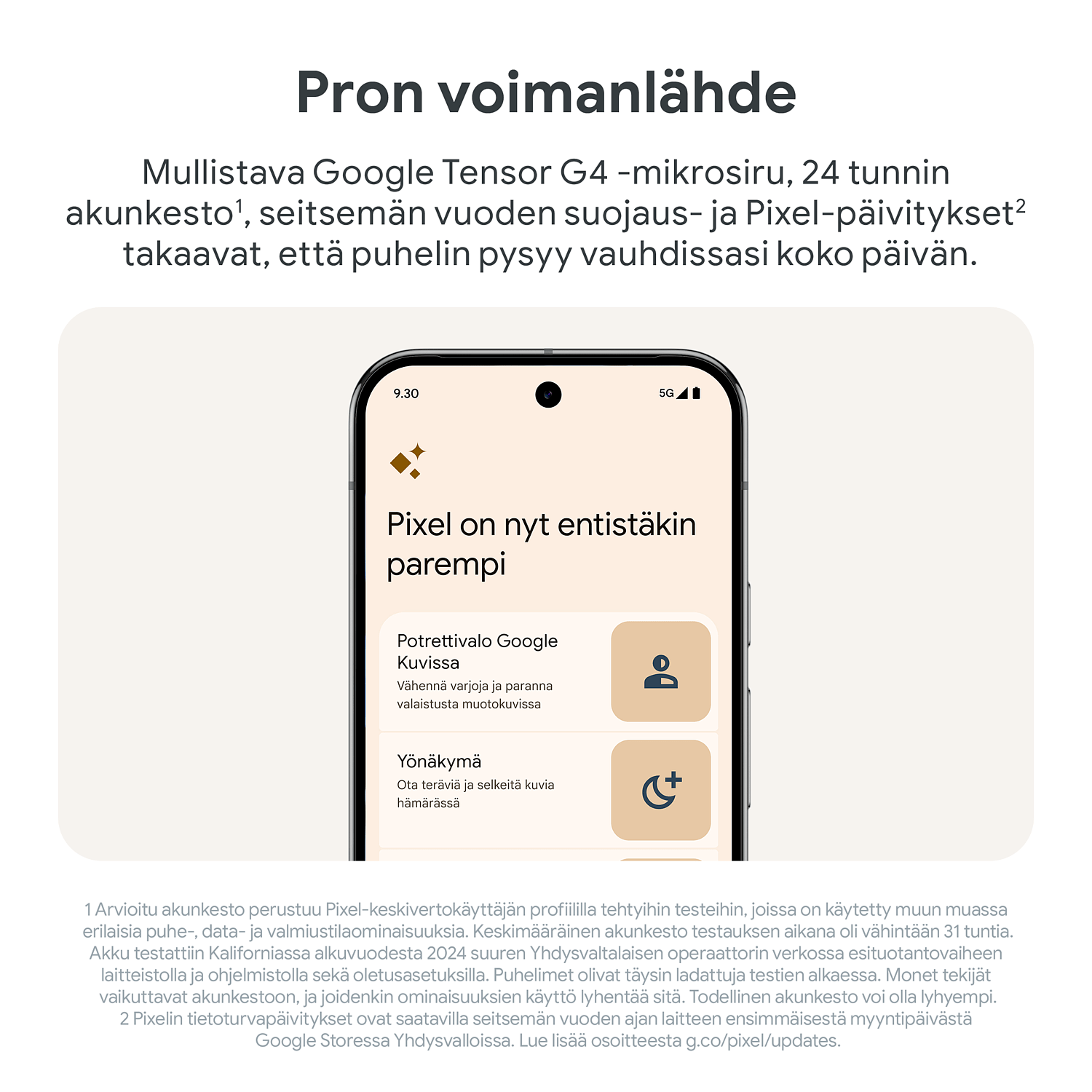 Pixel 9 Pron akussa riittää virtaa yli 24 tunniksi ja akun tehosäästöllä jopa 100 tunniksi. Akku latautuu 55 prosenttiin noin 30 minuutissa.