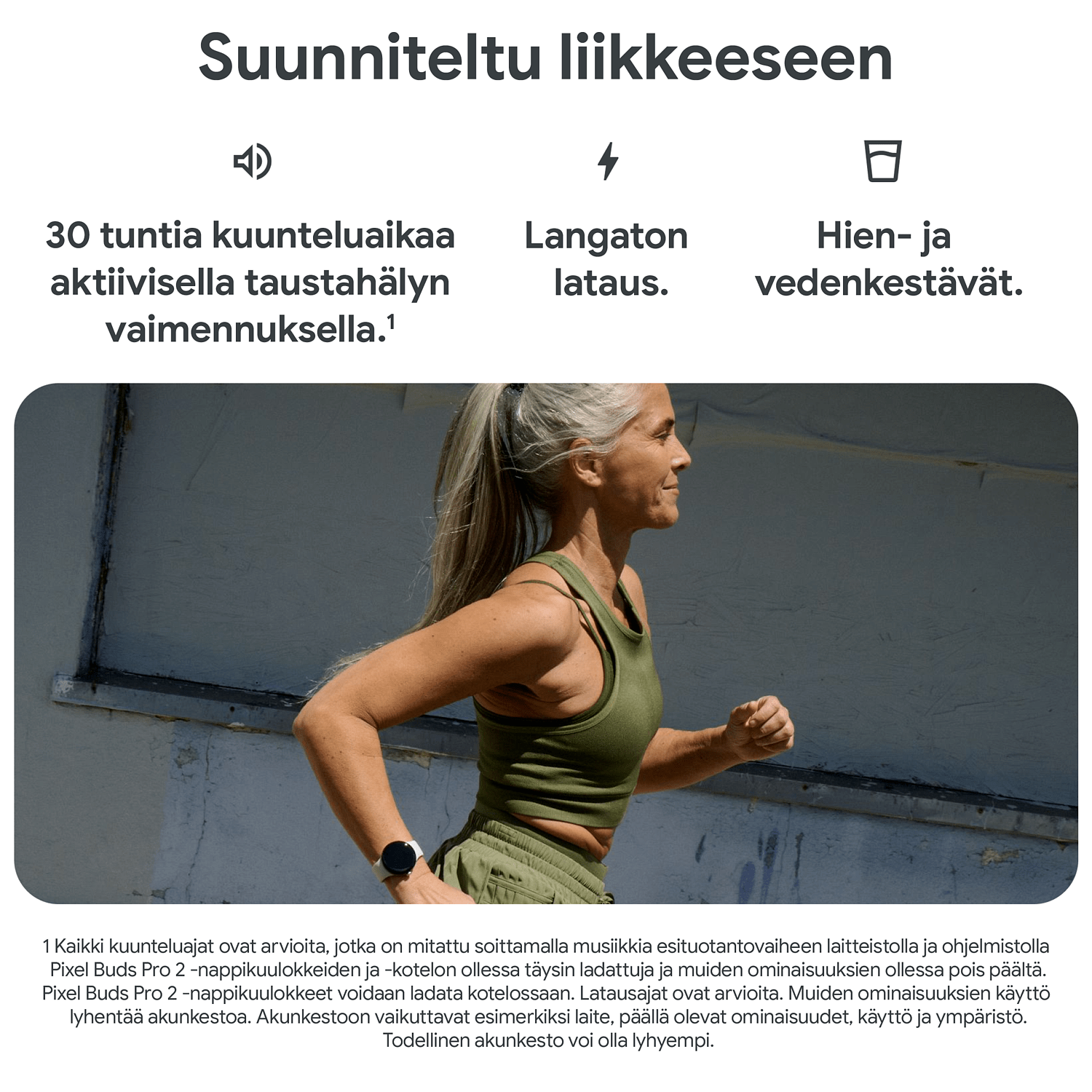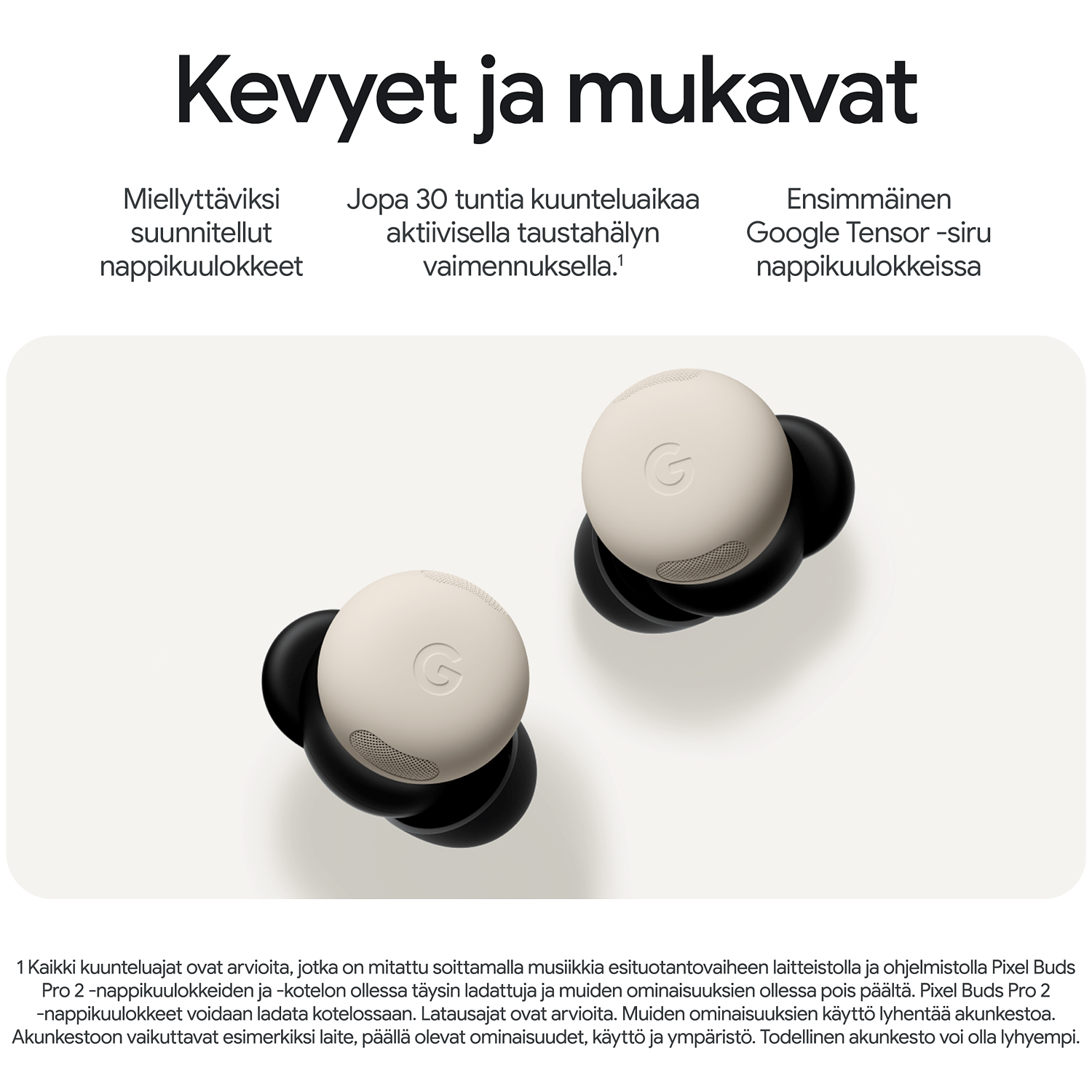 Pixel Buds Pro 2 -nappikuulokkeiden käyttö on miellyttävää, ja ne istuvat hyvin korvaan. Nappikuulokkeissa hyödynnetään Googlen tekoälyä ja Tensor-mikrosirua, joka takaa ensiluokkaisen immersiivisen äänen ja vaimentaa ääntä tehokkaasti. Pixel Buds Pro 2 -nappikuulokkeet ovat paras valinta Pixel-puhelimen kanssa käytettäväksi.