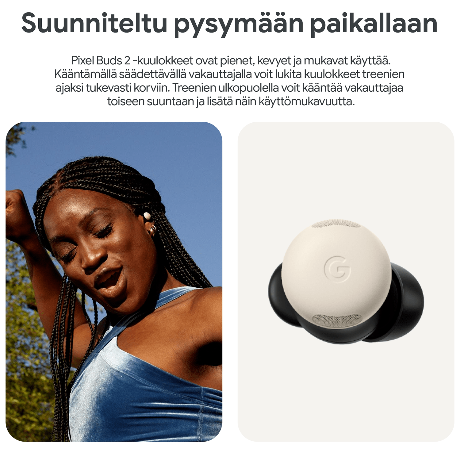 Pixel Buds Pro 2:n suunnittelussa on hyödynnetty 45 miljoonaa erilaisista korvista mitattua datapistettä. Kuulokkeet ovat pienet, kevyet ja mukavat käyttää vaikka koko päivän.