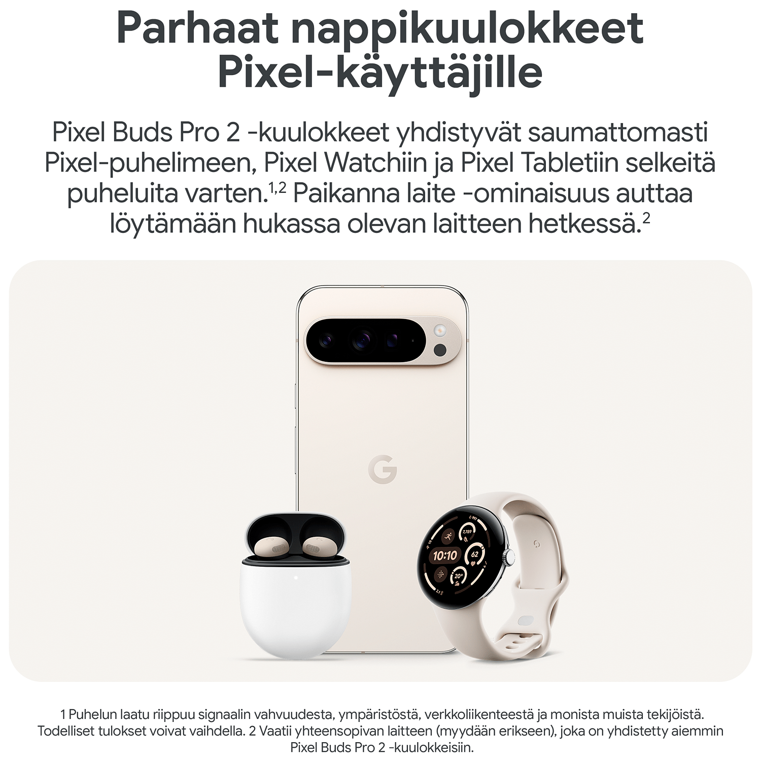 Pixel Buds Pro 2 integroituu monipuolisesti muiden Pixel-laitteiden kanssa. Selkeä-ääniset puhelut, Paikanna laite, saumaton vaihtaminen ja muut ominaisuudet tekevät niistä parhaat nappikuulokkeet Pixel-laitteille.
