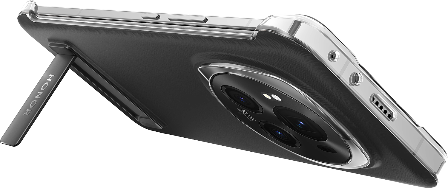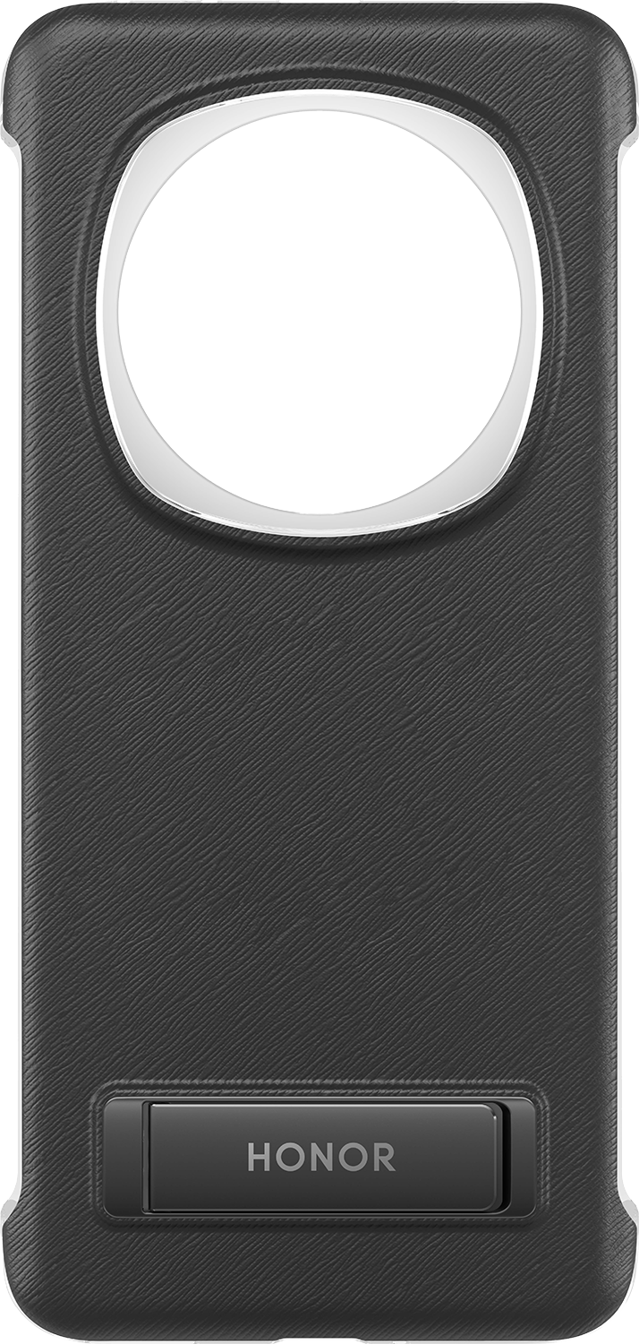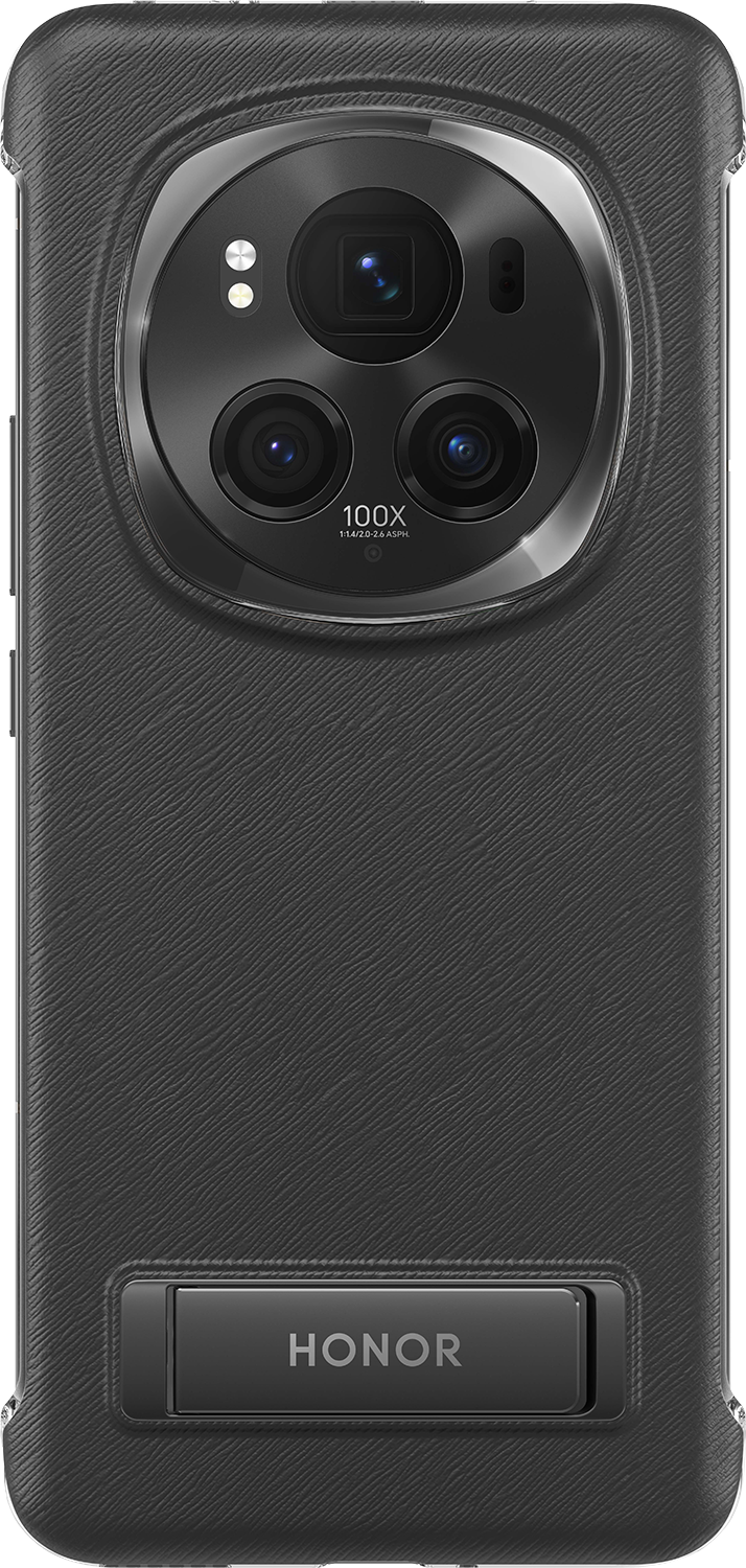 Suojakuoren reunus on kirkkaanvärinen, ja takaosan väritys sekä pintarakenne myötäilevät Magic 6 Pro -puhelinten tekonahkakuosia. Lisäksi kuoressa on sisäänrakennettu seisontatuki, jonka voit taittaa esiin selfievalokuvausta tai videoiden katselua varten.